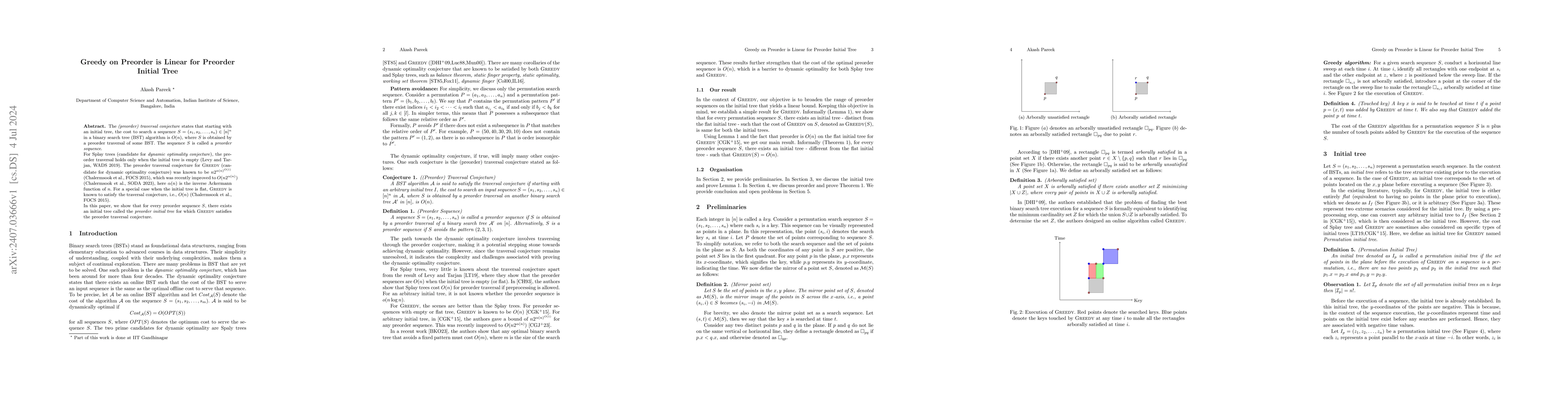 This paper demonstrates that for any preorder sequence, there exists an initial tree—referred to as the preorder initial tree—for which the GREEDY algorithm achieves an $O(n)$ cost in traversing the sequence within a binary search tree, confirming the preorder traversal conjecture.