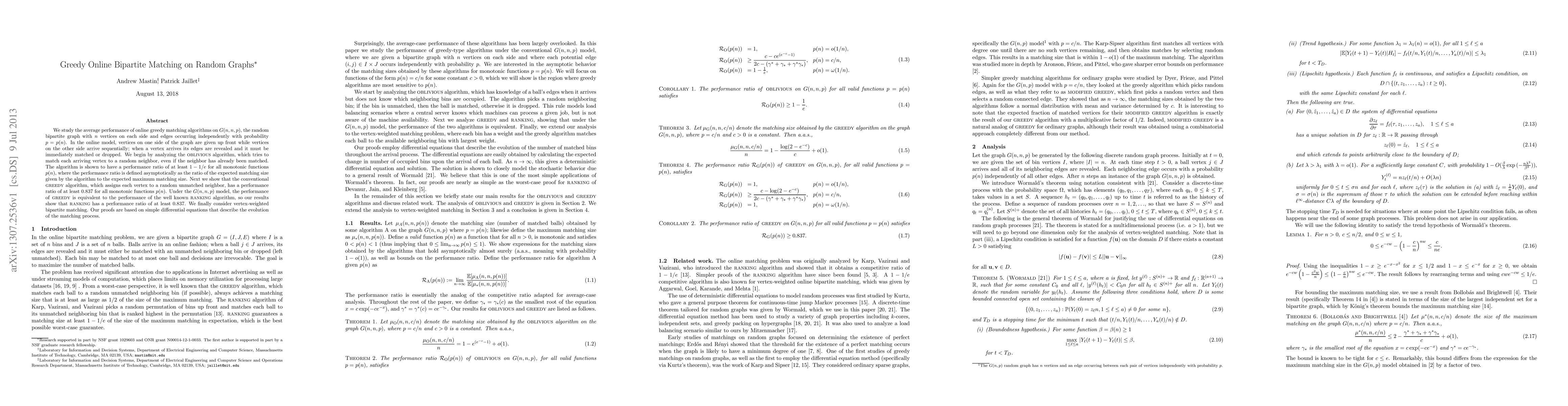 The paper analyzes the performance of online greedy matching algorithms on random bipartite graphs G(n,n,p) using differential equations to model the evolution of the matching process.