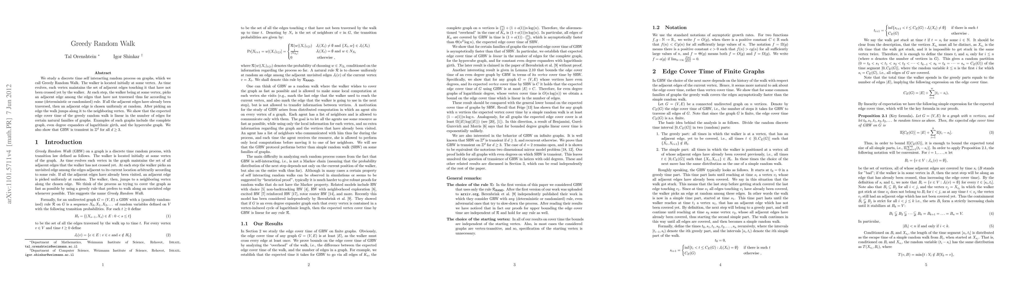 We study a discrete time self interacting random process on graphs, which we call Greedy Random Walk. The walker is located initially at some vertex. As time evolves, each vertex maintains the set of adjacent edges touching it that have not been crossed yet by the walker. At each step, the walker being at some vertex, picks an adjacent edge among the edges that have not traversed thus far according to some (deterministic or randomized) rule. If all the adjacent edges have already been traversed, then an adjacent edge is chosen uniformly at random. After picking an edge the walk jumps along it to the neighboring vertex. We show that the expected edge cover time of the greedy random walk is linear in the number of edges for certain natural families of graphs. Examples of such graphs include the complete graph, even degree expanders of logarithmic girth, and the hypercube graph. We also show that GRW is transient in $\Z^d$ for all $d \geq 3$.
