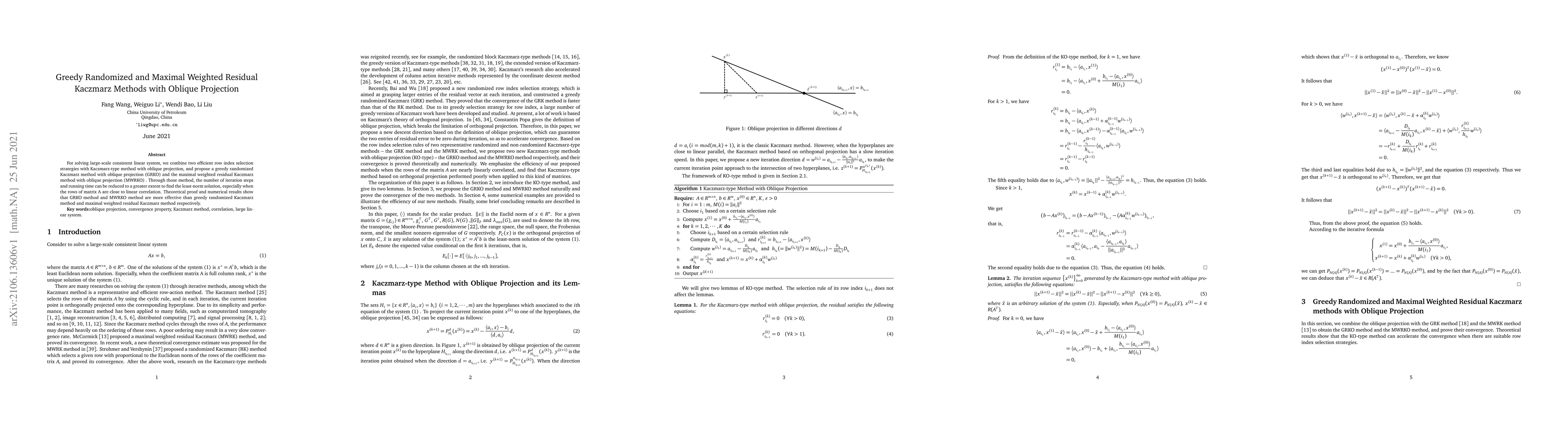 This paper proposes two new Kaczmarz-type methods—GRKO and MWRKO—that combine efficient row index selection strategies with oblique projection to solve large-scale consistent linear systems. Both methods significantly reduce iteration steps and running time for finding the least-norm solution, especially when matrix rows exhibit linear correlation, outperforming their respective standard Kaczmarz counterparts.