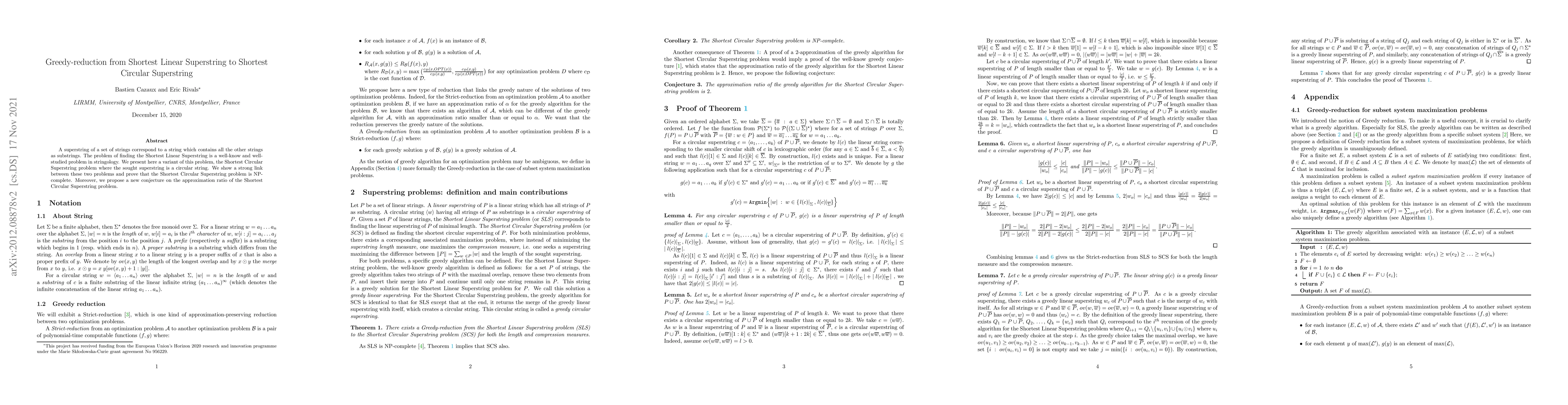 This paper explores the relationship between the Shortest Linear Superstring and Shortest Circular Superstring problems, proving that the latter is NP-complete. It also proposes a new conjecture regarding the approximation ratio for the Shortest Circular Superstring problem.