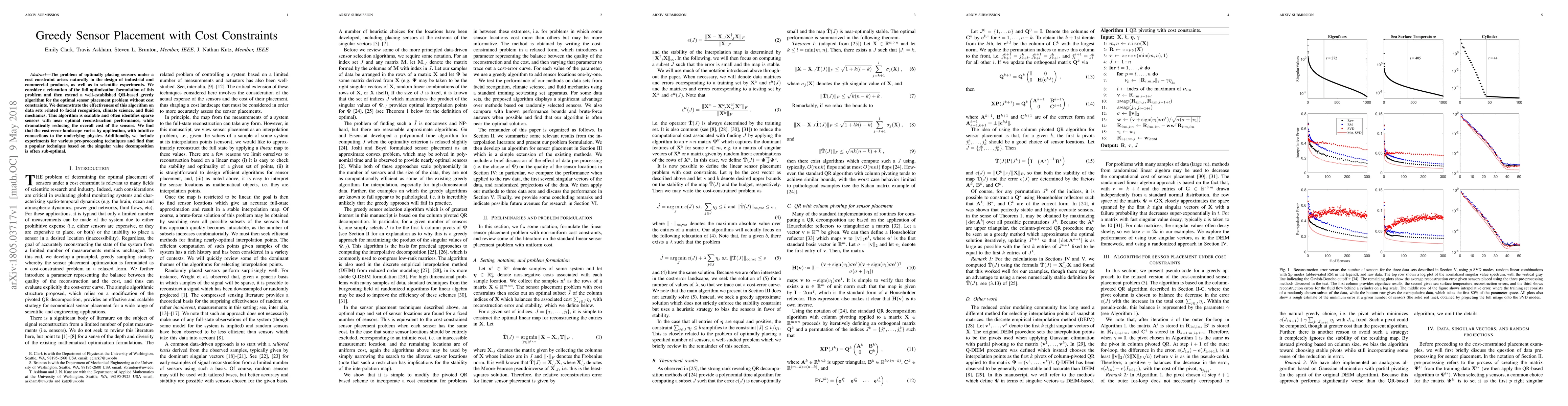 This paper proposes a QR-based greedy algorithm for sensor placement under cost constraints, demonstrating its effectiveness across facial recognition, climate science, and fluid mechanics. The algorithm achieves near-optimal reconstruction performance while significantly reducing sensor costs, though pre-processing techniques like singular value decomposition are often found to be suboptimal.