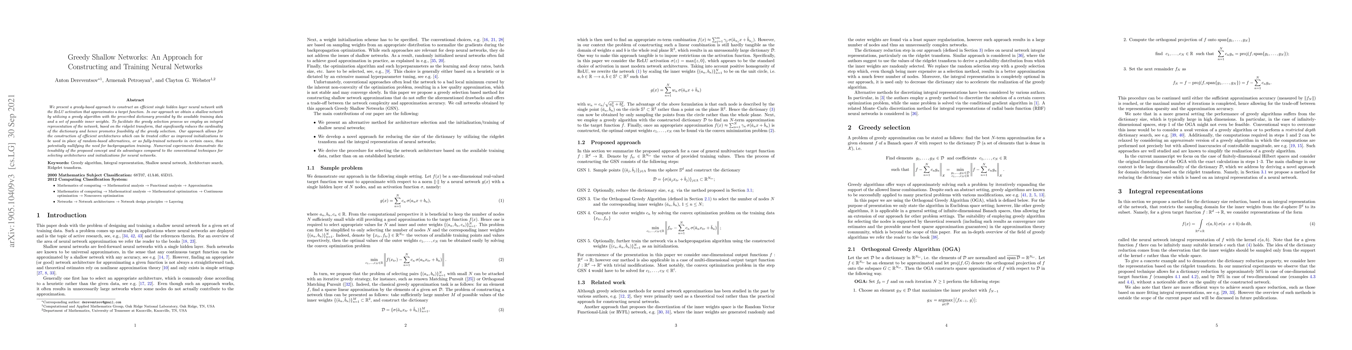 A greedy-based approach constructs efficient single hidden layer neural networks with ReLU activation that approximate target functions, promoting feasible architectures without backpropagation training.