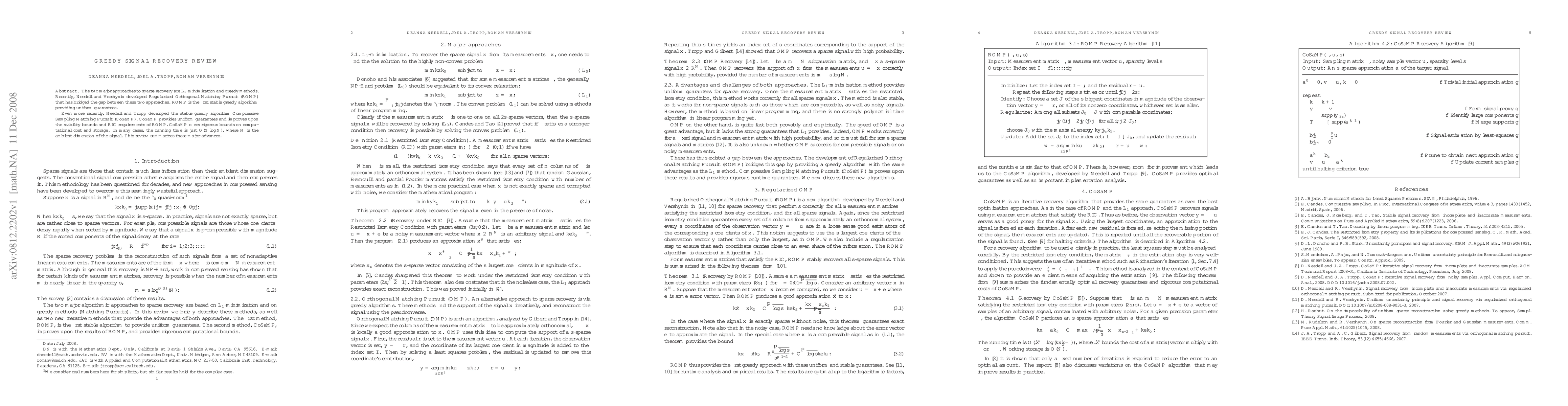 The two major approaches to sparse recovery are L1-minimization and greedy methods. Recently, Needell and Vershynin developed Regularized Orthogonal Matching Pursuit (ROMP) that has bridged the gap between these two approaches. ROMP is the first stable greedy algorithm providing uniform guarantees. Even more recently, Needell and Tropp developed the stable greedy algorithm Compressive Sampling Matching Pursuit (CoSaMP). CoSaMP provides uniform guarantees and improves upon the stability bounds and RIC requirements of ROMP. CoSaMP offers rigorous bounds on computational cost and storage. In many cases, the running time is just O(NlogN), where N is the ambient dimension of the signal. This review summarizes these major advances.