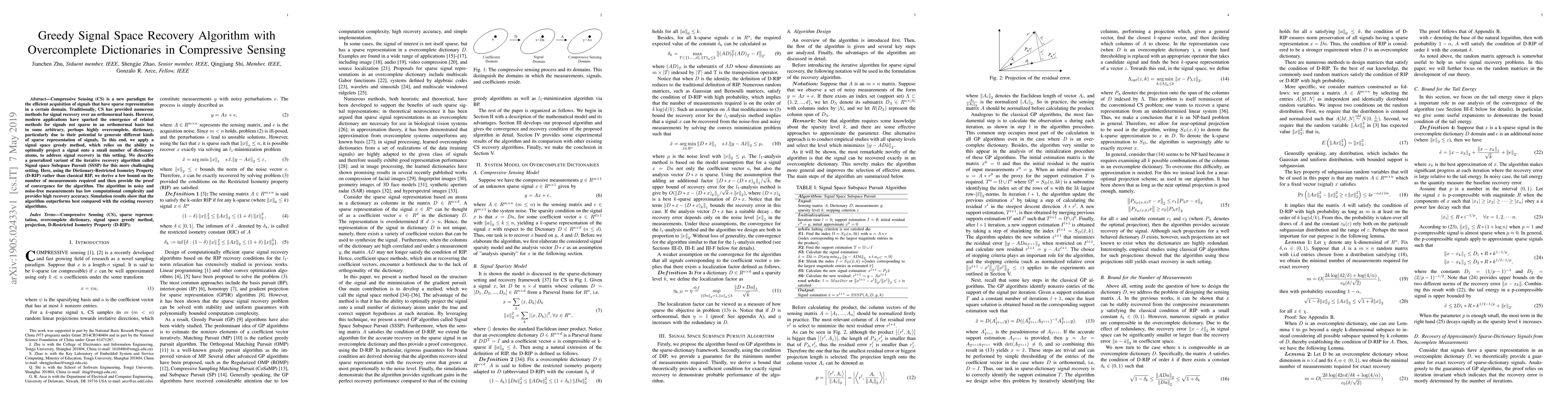 This paper proposes a Signal space Subspace Pursuit (SSSP) algorithm for Compressive Sensing using overcomplete dictionaries, leveraging the Dictionary-Restricted Isometry Property (D-RIP) to derive a lower bound on measurement requirements and prove convergence. The algorithm demonstrates high recovery accuracy and lower computational complexity compared to existing methods.