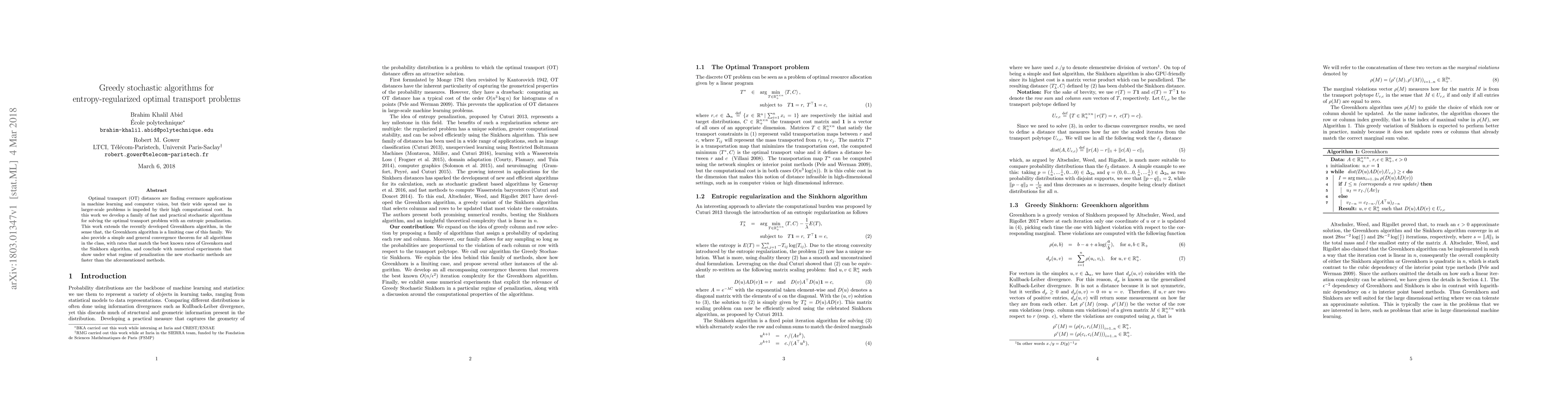 This paper introduces a series of efficient stochastic algorithms for entropy-regularized optimal transport problems, which are widely used in machine learning and computer vision but suffer from high computational costs. The proposed algorithms extend the Greenkhorn algorithm and achieve convergence rates comparable to the Sinkhorn algorithm, with numerical experiments demonstrating their speed advantages under certain penalization regimes.