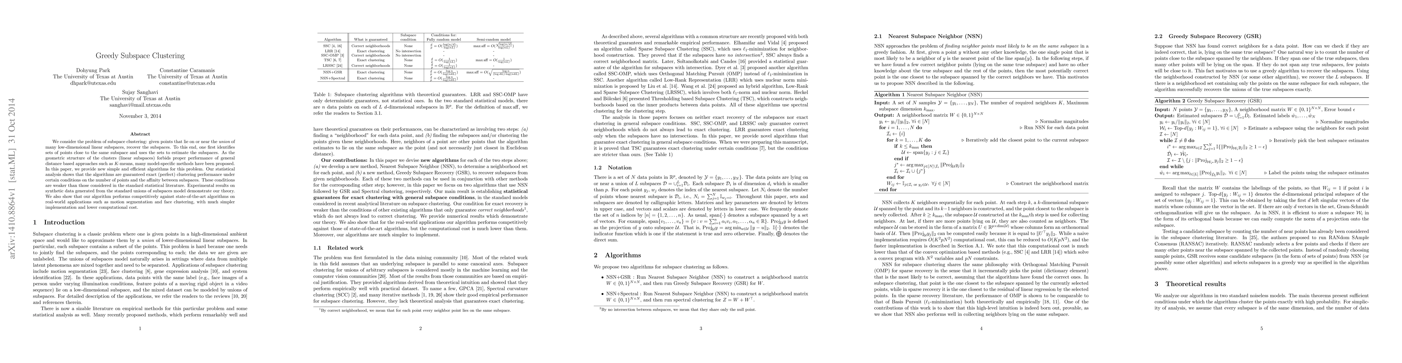 This paper proposes simple and efficient algorithms for subspace clustering, achieving guaranteed exact performance under certain conditions, and demonstrates competitive results against state-of-the-art methods on real-world applications.