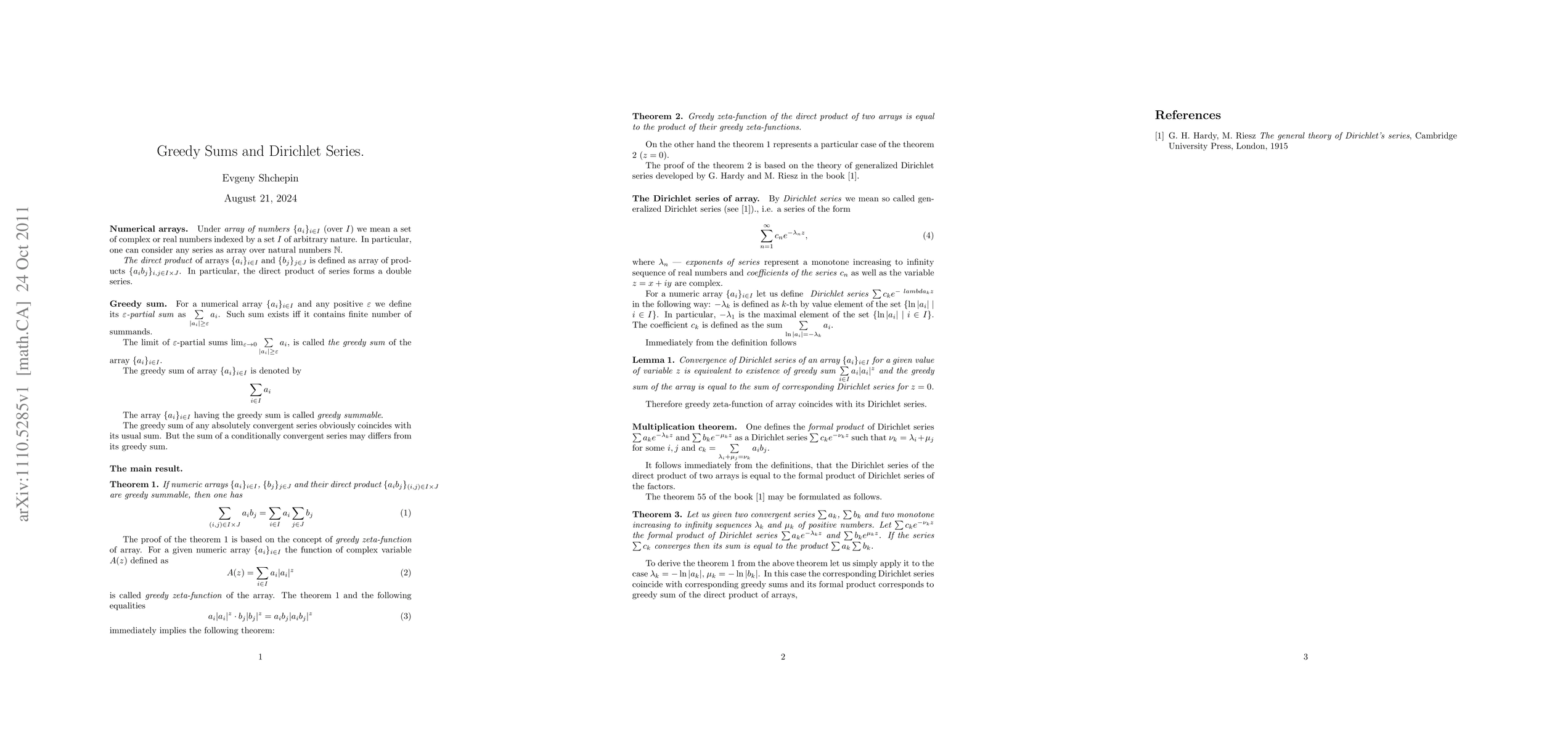 Summary: This paper demonstrates that the greedy sum of the direct product of two numeric arrays of complex numbers equals the product of the individual greedy sums of the arrays, given that all sums exist. This result extends the properties of greedy sums to product structures.