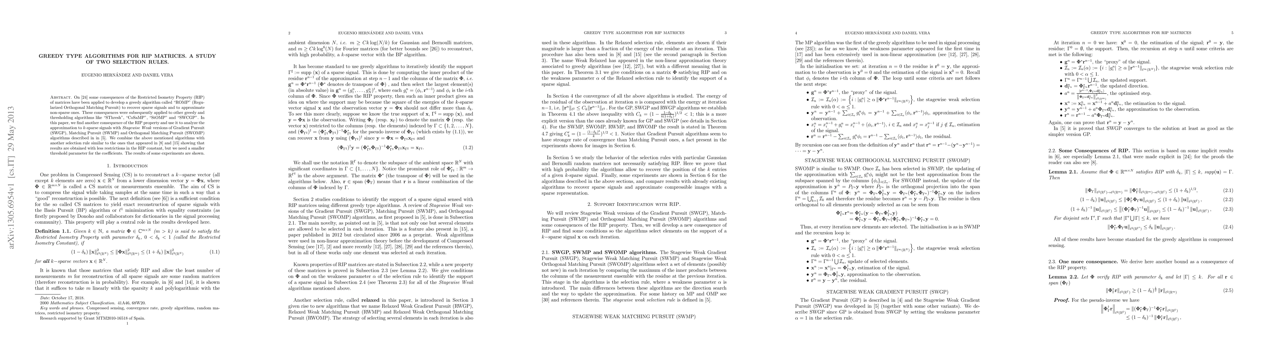 Some consequences of the Restricted Isometry Property (RIP) of matrices have been applied to develop a greedy algorithm called "ROMP" (Regularized Orthogonal Matching Pursuit) to recover sparse signals and to approximate non-sparse ones. These consequences were subsequently applied to other greedy and thresholding algorithms like "SThresh", "CoSaMP", "StOMP" and "SWCGP". In this paper, we find another consequence of the RIP property and use it to analyze the approximation to k-sparse signals with Stagewise Weak versions of Gradient Pursuit (SWGP), Matching Pursuit (SWMP) and Orthogonal Matching Pursuit (SWOMP). We combine the above mentioned algorithms with another selection rule similar to the ones that have appeared in the literature showing that results are obtained with less restrictions in the RIP constant, but we need a smaller threshold parameter for the coefficients. The results of some experiments are shown.