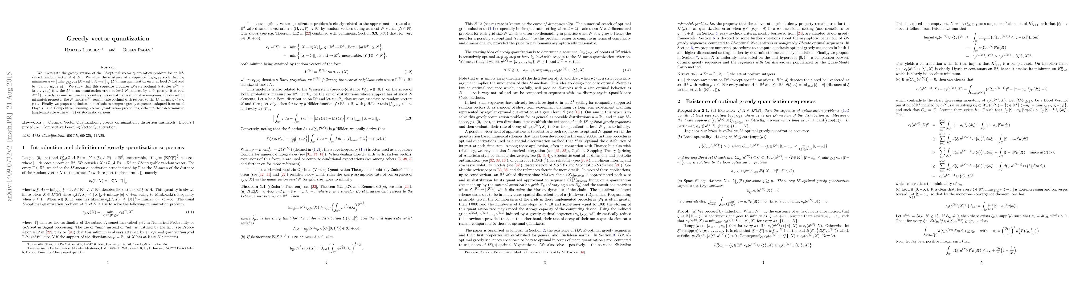 This paper introduces greedy vector quantization for $L^p$-optimal vector quantization, showing the existence of a sequence that minimizes mean quantization error at each level $N$. The proposed method produces rate-optimal sequences with distortion mismatch property.