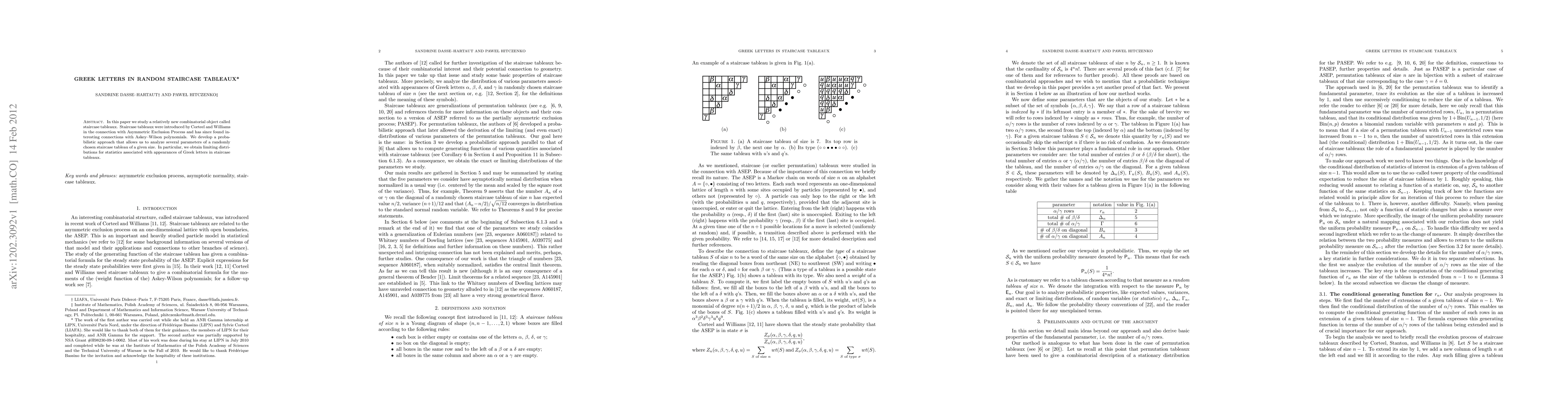 This paper explores the combinatorial structure of staircase tableaux, introduced in relation to Asymmetric Exclusion Process and Askey-Wilson polynomials, using a probabilistic approach to analyze their parameters. It focuses on the limiting distributions of statistics related to the appearances of Greek letters in these tableaux.