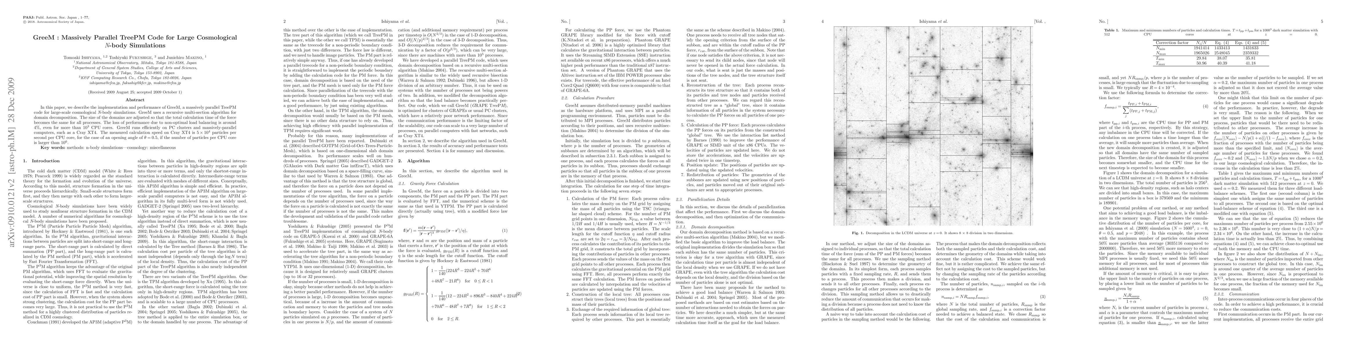 Summary: GreeM is a high-performance, massively parallel TreePM code designed for large-scale cosmological N-body simulations, achieving efficient load balancing and high calculation speeds on clusters and supercomputers like Cray XT4, with minimal performance loss.