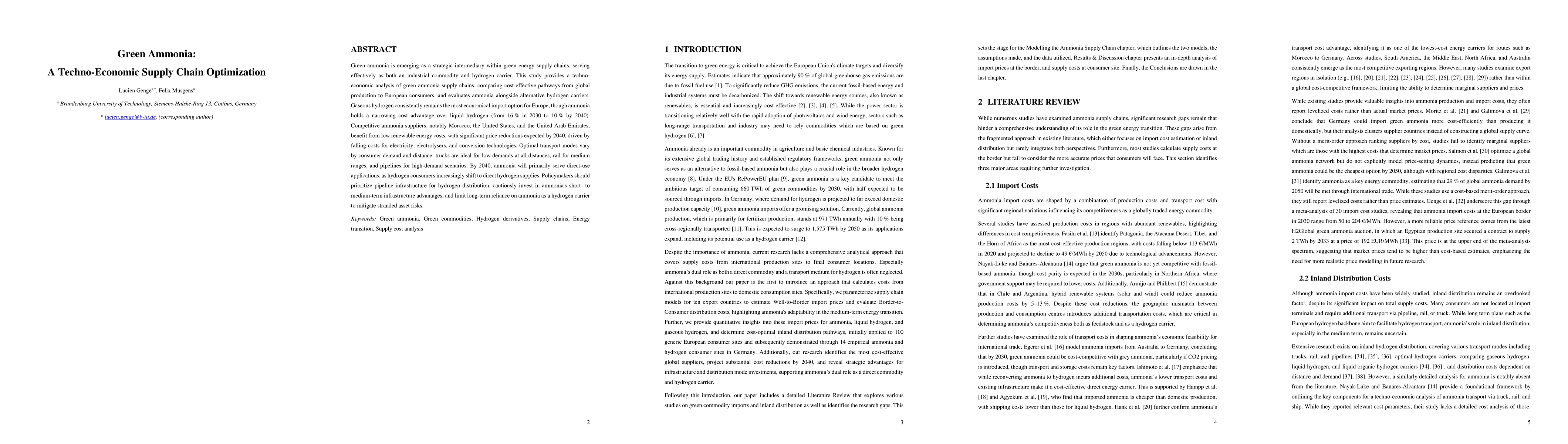 Green ammonia is emerging as a strategic intermediary within green energy supply chains, serving effectively as both an industrial commodity and hydrogen carrier. This study provides a techno-economic analysis of green ammonia supply chains, comparing cost-effective pathways from global production to European consumers, and evaluates ammonia alongside alternative hydrogen carriers. Gaseous hydrogen consistently remains the most economical import option for Europe, though ammonia holds a narrowing cost advantage over liquid hydrogen (from 16 % in 2030 to 10 % by 2040). Competitive ammonia suppliers, notably Morocco, the United States, and the United Arab Emirates, benefit from low renewable energy costs, with significant price reductions expected by 2040, driven by falling costs for electricity, electrolysers, and conversion technologies. Optimal transport modes vary by consumer demand and distance: trucks are ideal for low demands at all distances, rail for medium ranges, and pipelines for high-demand scenarios. By 2040, ammonia will primarily serve direct-use applications, as hydrogen consumers increasingly shift to direct hydrogen supplies. Policymakers should prioritize pipeline infrastructure for hydrogen distribution, cautiously invest in ammonia's short- to medium-term infrastructure advantages, and limit long-term reliance on ammonia as a hydrogen carrier to mitigate stranded asset risks.
