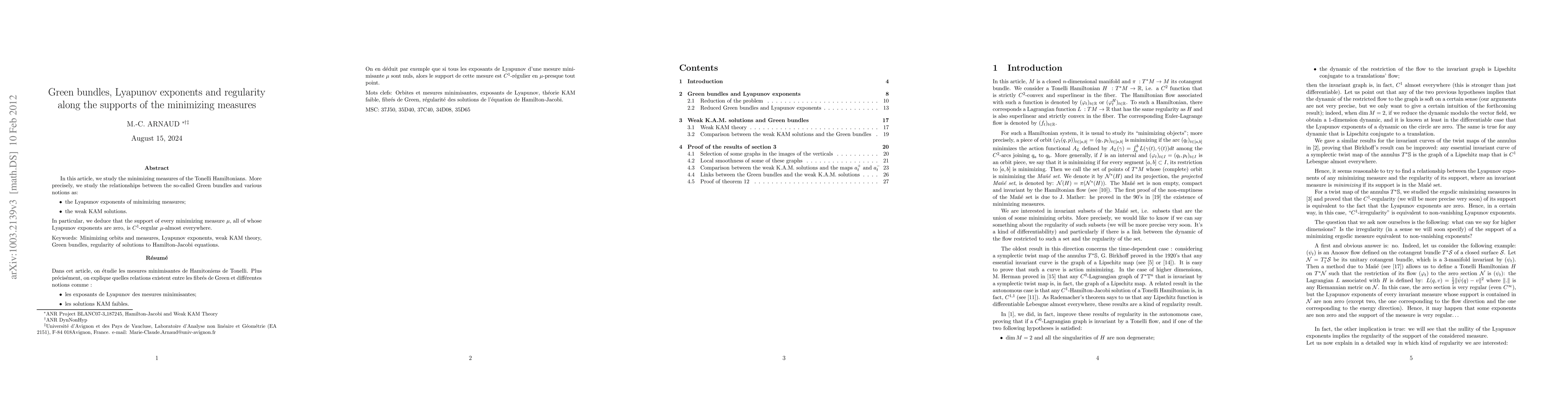 In this article, we study the minimizing measures of the Tonelli Hamiltonians. More precisely, we study the relationships between the so-called Green bundles and various notions as: - the Lyapunov exponents of minimizing measures; -the weak KAM solutions. In particular, we deduce that the support of every minimizing measure all of whose Lyapunov exponents are zero is C1-regular almost everywhere.