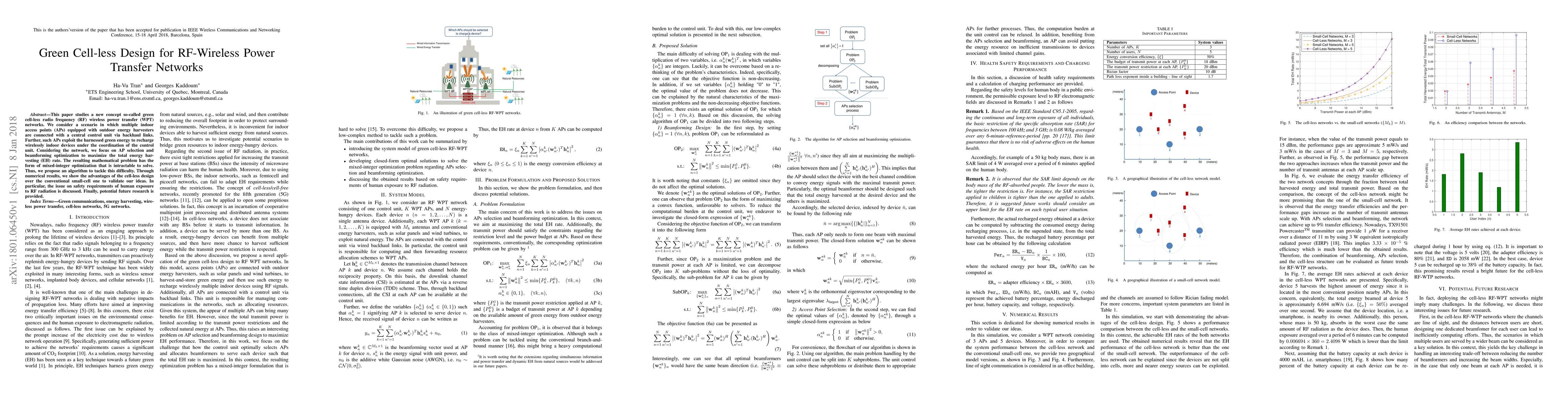 This paper proposes a green cell-less RF wireless power transfer network where multiple indoor access points use harvested green energy to recharge devices, optimizing AP selection and beamforming to maximize energy harvesting. An algorithm is developed to solve the intractable mixed-integer optimization problem, demonstrating advantages over conventional small-cell networks and addressing safety concerns regarding RF radiation exposure.