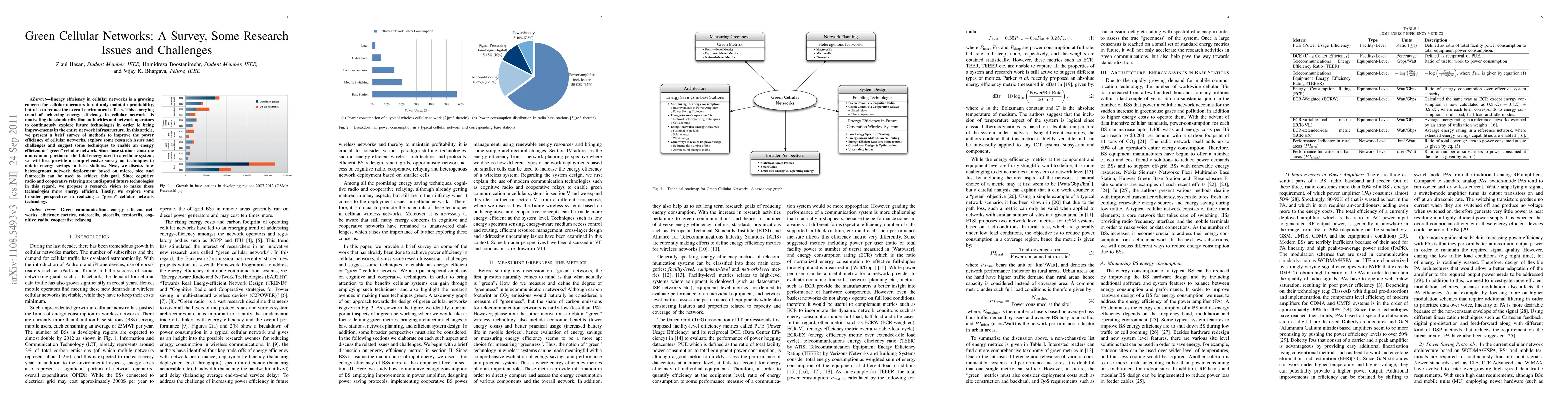 This paper surveys methods to enhance energy efficiency in cellular networks, focusing on base station power savings and the deployment of heterogeneous networks. It also discusses future technologies like cognitive radio and cooperative relaying to achieve greener networks.