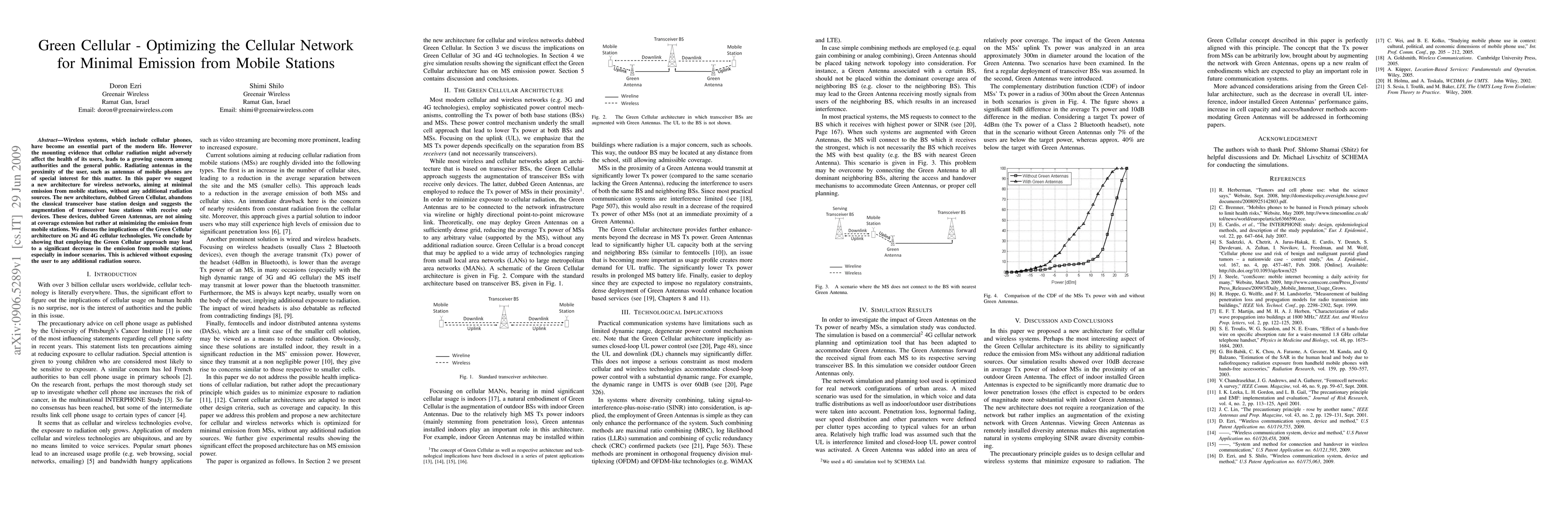 This paper proposes a new Green Cellular architecture to minimize emissions from mobile stations in wireless networks, using augmented transceiver base stations with receive-only Green Antennas instead of traditional designs. The approach aims to reduce radiation exposure without adding new radiation sources, potentially leading to significant emission reductions, especially indoors.