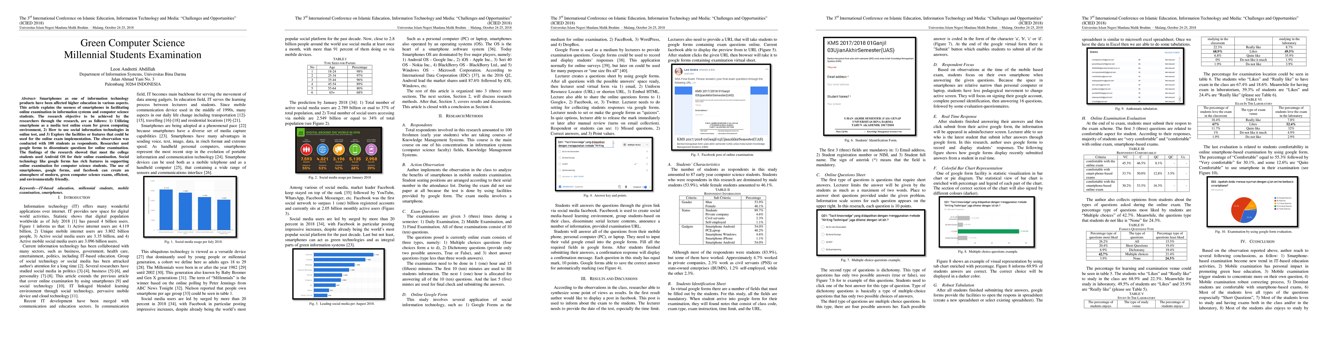 This study examines the use of smartphones and social technologies for online exams in information systems and computer science courses, finding that Android devices and tools like Google Forms facilitate efficient, modern, and environmentally friendly green computing exams. The research involved 100 millennial students, highlighting the potential of such technologies for future online assessments.
