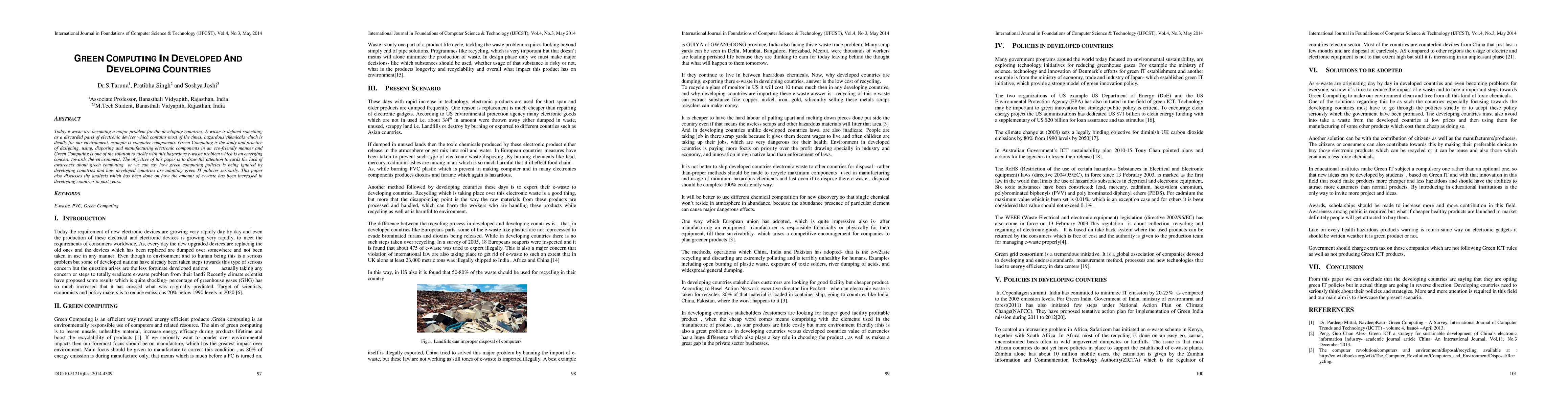 This paper highlights the growing e-waste problem in developing countries and emphasizes the need for green computing practices to mitigate environmental harm. It also discusses the lack of awareness about green computing policies among developing nations and their adoption by developed countries.