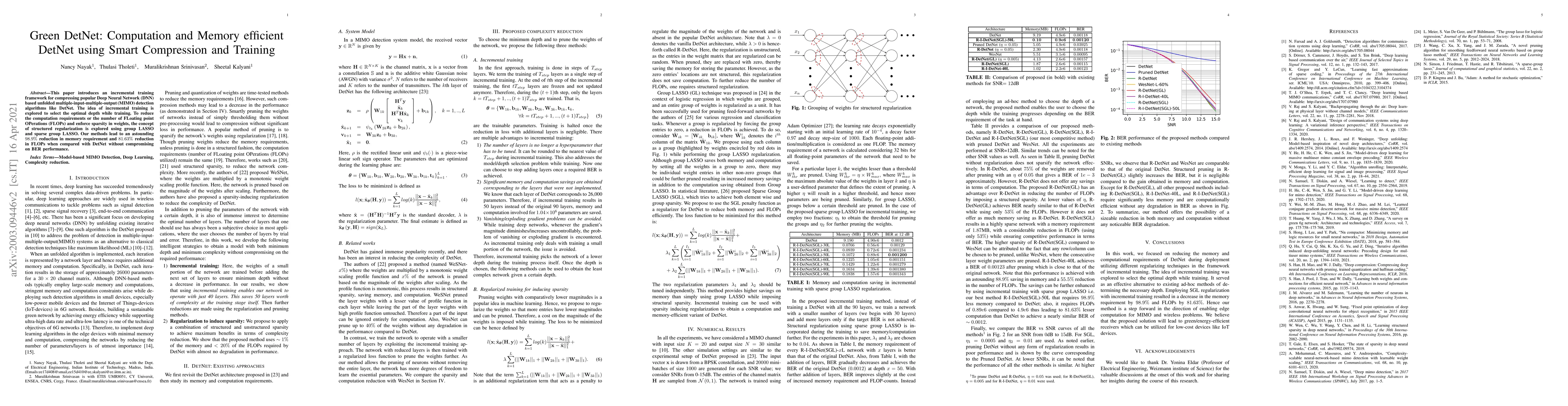 This paper introduces an incremental training framework for compressing popular Deep Neural Network (DNN) based unfolded multiple-input-multiple-output (MIMO) detection algorithms like DetNet. The idea of incremental training is explored to select the optimal depth while training. To reduce the computation requirements or the number of FLoating point OPerations (FLOPs) and enforce sparsity in weights, the concept of structured regularization is explored using group LASSO and sparse group LASSO. Our methods lead to an astounding $98.9\%$ reduction in memory requirement and $81.63\%$ reduction in FLOPs when compared with DetNet without compromising on BER performance.