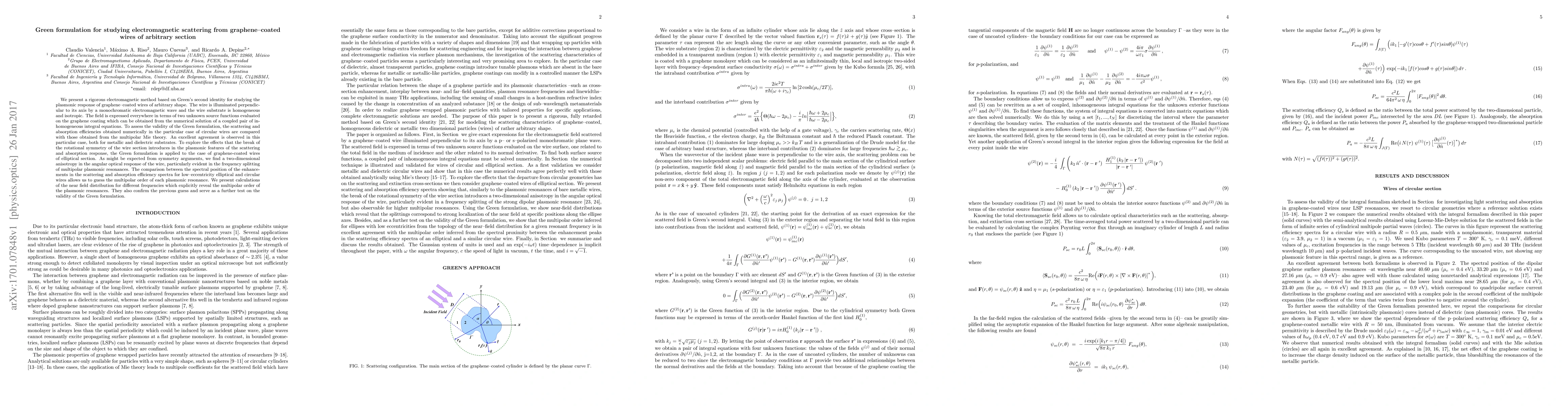 We present a rigorous electromagnetic method based on Green's second identity for studying the plasmonic response of graphene-coated wires of arbitrary shape. The wire is illuminated perpendicular to its axis by a monochromatic electromagnetic wave and the wire substrate is homogeneous and isotropic. The field is expressed everywhere in terms of two unknown source functions evaluated on the graphene coating which can be obtained from the numerical solution of a coupled pair of inhomogeneous integral equations. To assess the validity of the Green formulation, the scattering and absorption efficiencies obtained numerically in the particular case of circular wires are compared with those obtained from the multipolar Mie theory. An excellent agreement is observed in this particular case, both for metallic and dielectric substrates. To explore the effects that the break of the rotational symmetry of the wire section introduces in the plasmonic features of the scattering and absorption response, the Green formulation is applied to the case of graphene-coated wires of elliptical section. As might be expected from symmetry arguments, we find a two-dimensional anisotropy in the angular optical response of the wire, particularly evident in the frequency splitting of multipolar plasmonic resonances. The comparison between the spectral position of the enhancements in the scattering and absorption efficiency spectra for low-eccentricity elliptical and circular wires allows us to guess the multipolar order of each plasmonic resonance. We present calculations of the near field distribution for different frequencies which explicitly reveal the multipolar order of the plasmonic resonances. They also confirm the previous guess and serve as a further test on the validity of the Green formulation.