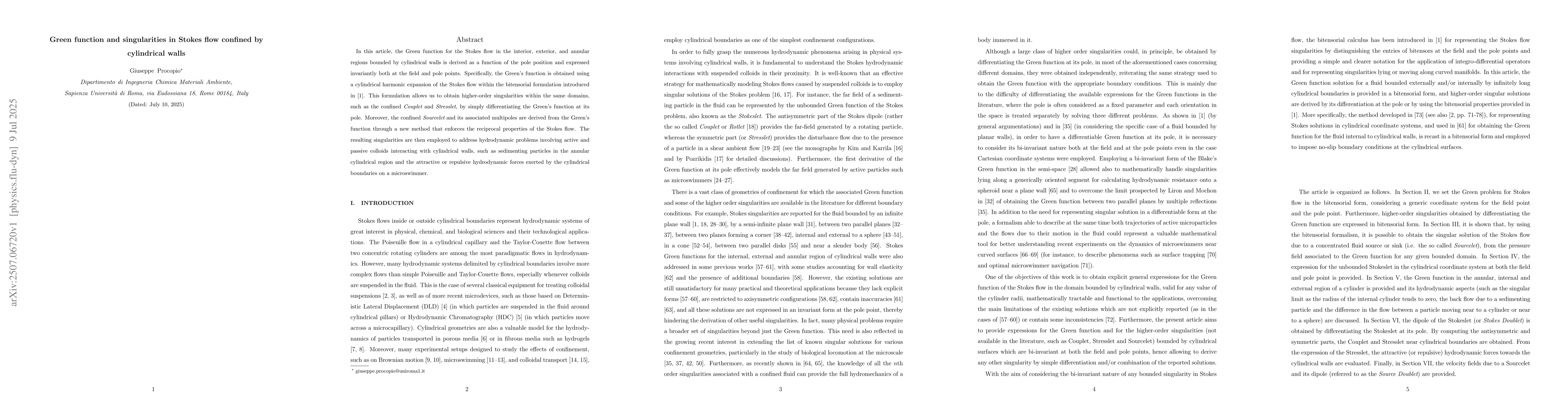 In this article, the Green function for the Stokes flow in the interior, exterior, and annular regions bounded by cylindrical walls is derived as a function of the pole position and expressed invariantly both at the field and pole points. Specifically, the Green function is obtained using a cylindrical harmonic expansion of the Stokes flow within the bitensorial formulation. This formulation allows us to obtain higher-order singularities within the same domains, such as the confined Couplet and Stresslet, by simply differentiating the Green function at its pole. Moreover, the confined Sourcelet and its associated multipoles are derived from the Green function through a new method that enforces the reciprocal properties of the Stokes flow. The resulting singularities are then employed to address hydrodynamic problems involving active and passive colloids interacting with cylindrical walls, such as sedimenting particles in the annular cylindrical region and the attractive or repulsive hydrodynamic forces exerted by the cylindrical boundaries on a microswimmer.