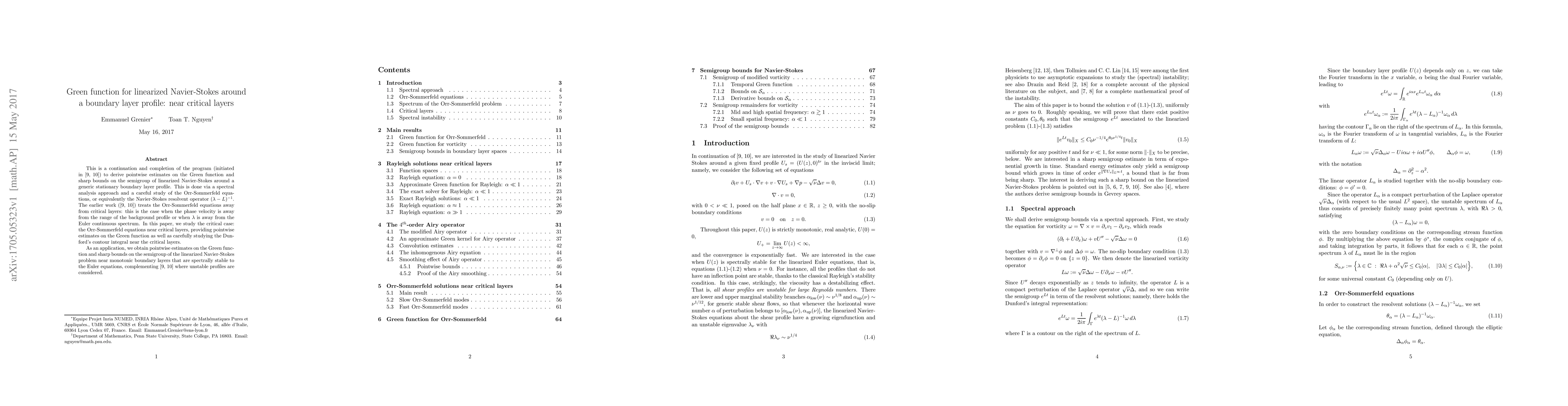 Researchers study the behavior of linearized Navier-Stokes equations near critical layers in boundary profiles, providing pointwise estimates on the Green function and bounds for the semigroup.