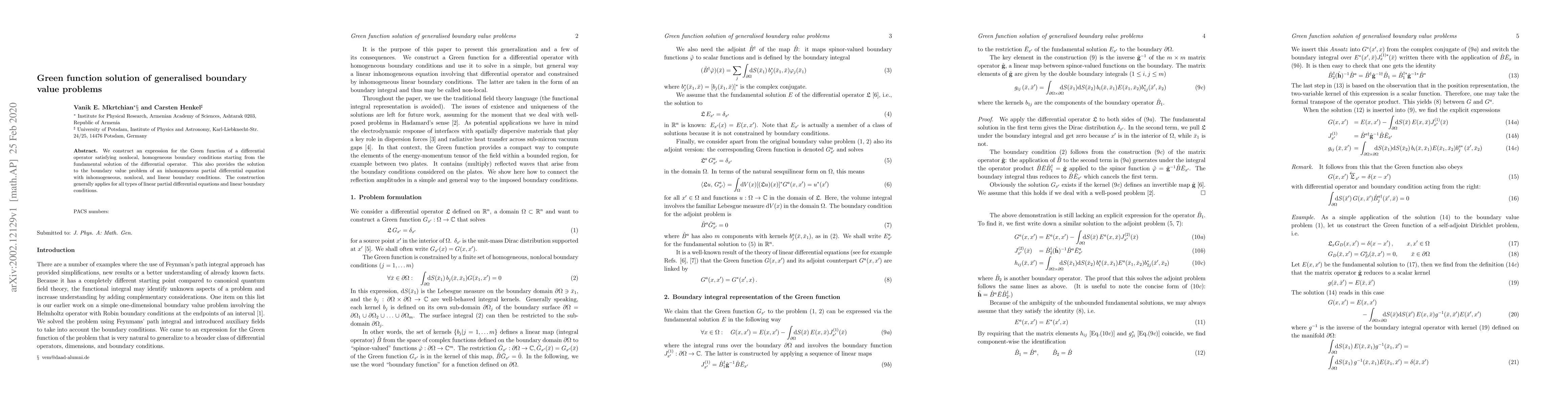 We construct an expression for the Green function of a differential operator satisfying nonlocal, homogeneous boundary conditions starting from the fundamental solution of the differential operator. This also provides the solution to the boundary value problem of an inhomogeneous partial differential equation with inhomogeneous, nonlocal, and linear boundary conditions. The construction generally applies for all types of linear partial differential equations and linear boundary conditions.