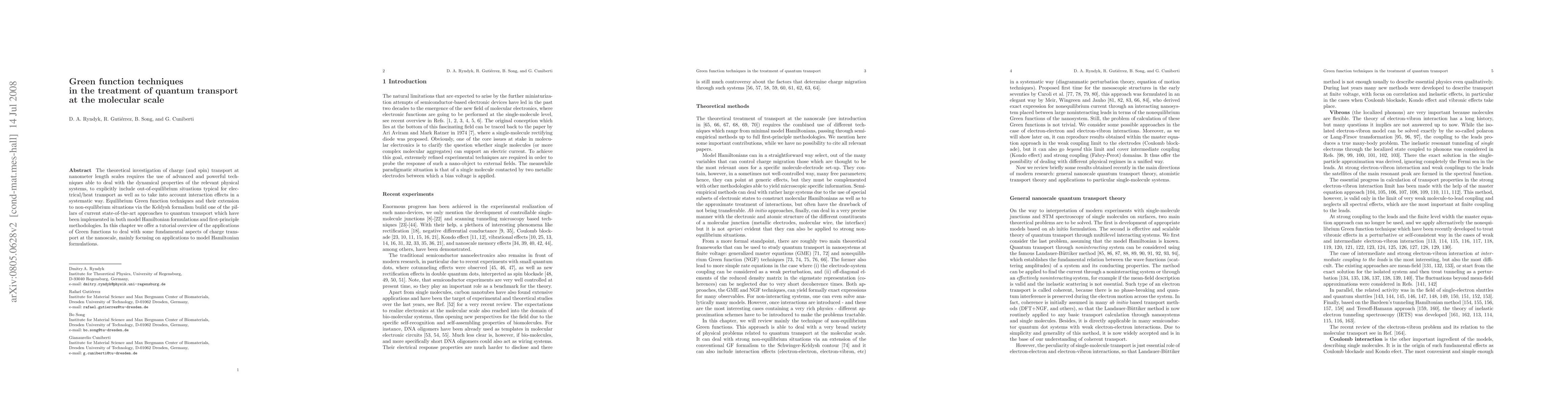 This paper explores how Green function techniques can be used to study quantum transport at a molecular scale, focusing on applications in model Hamiltonian formulations and first-principle methodologies.