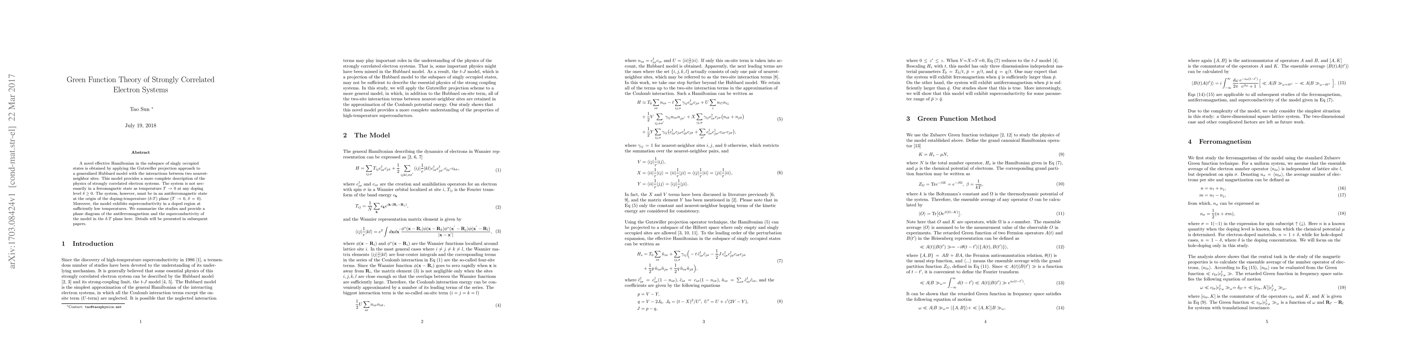 A novel effective Hamiltonian in the subspace of singly occupied states is obtained by applying the Gutzwiller projection approach to a generalized Hubbard model with the interactions between two nearest- neighbor sites. This model provides a more complete description of the physics of strongly correlated electron systems. The system is not necessarily in a ferromagnetic state as temperature approaches zero at any doping level. The system, however, must be in an antiferromagnetic state at the origin of the doping-temperature plane. Moreover, the model exhibits superconductivity in a doped region at sufficiently low temperatures. We summarize the studies and provide a phase diagram of the antiferromagnetism and the superconductivity of the model in the doping-temperature plane here. Details will be presented in subsequent papers.
