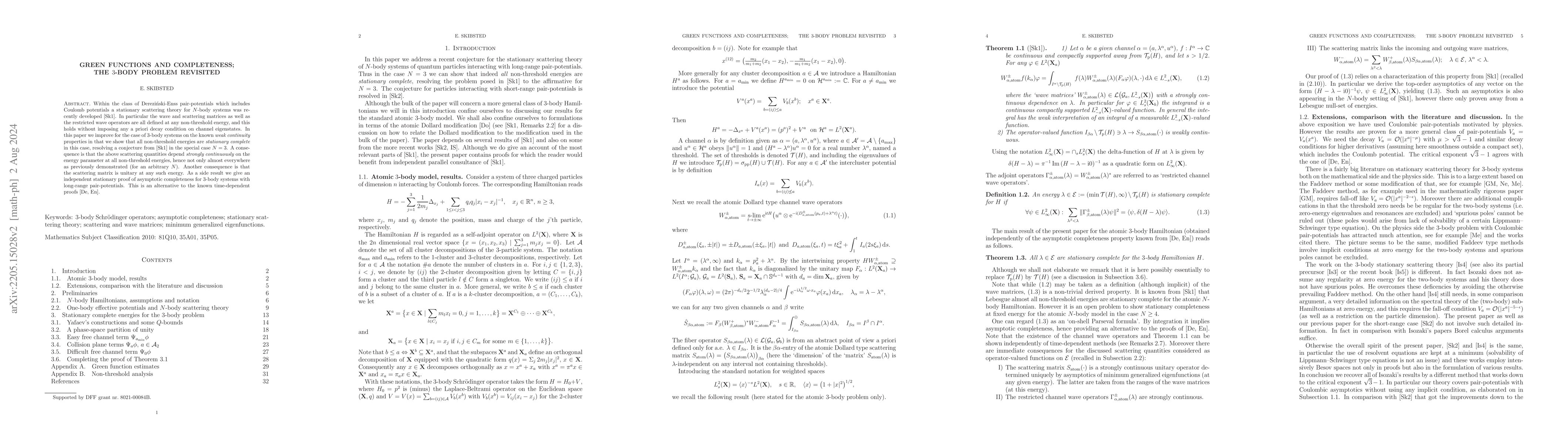 Researchers have shown that non-threshold energies in 3-body systems are stationary complete, resolving a conjecture, and found that the scattering matrix is unitary at any such energy.