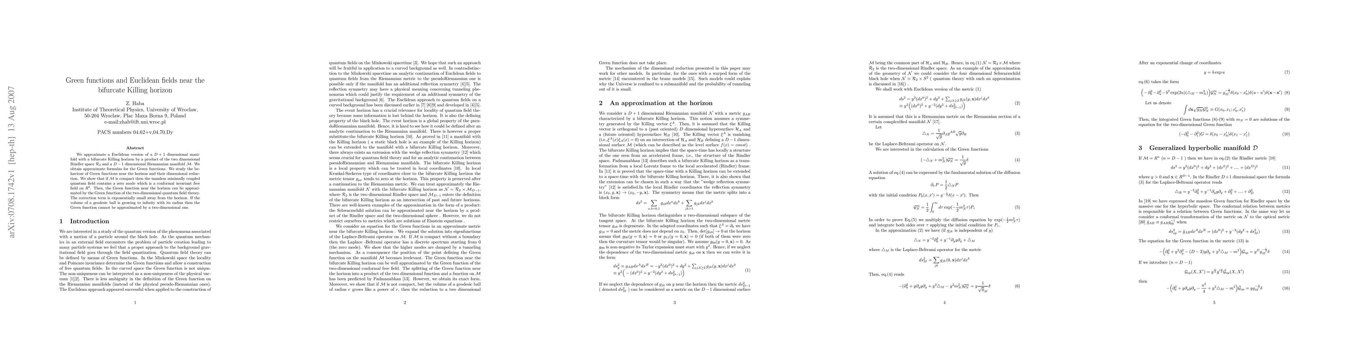 This paper studies Euclidean fields near a bifurcate Killing horizon in D+1 dimensional manifolds, approximating them by a product of Rindler space and a D-1 dimensional manifold M. It finds that if M is compact, the massless quantum field has a zero mode, allowing the Green function near the horizon to be approximated by a two-dimensional quantum field theory's Green function, with exponentially small corrections away from the horizon.