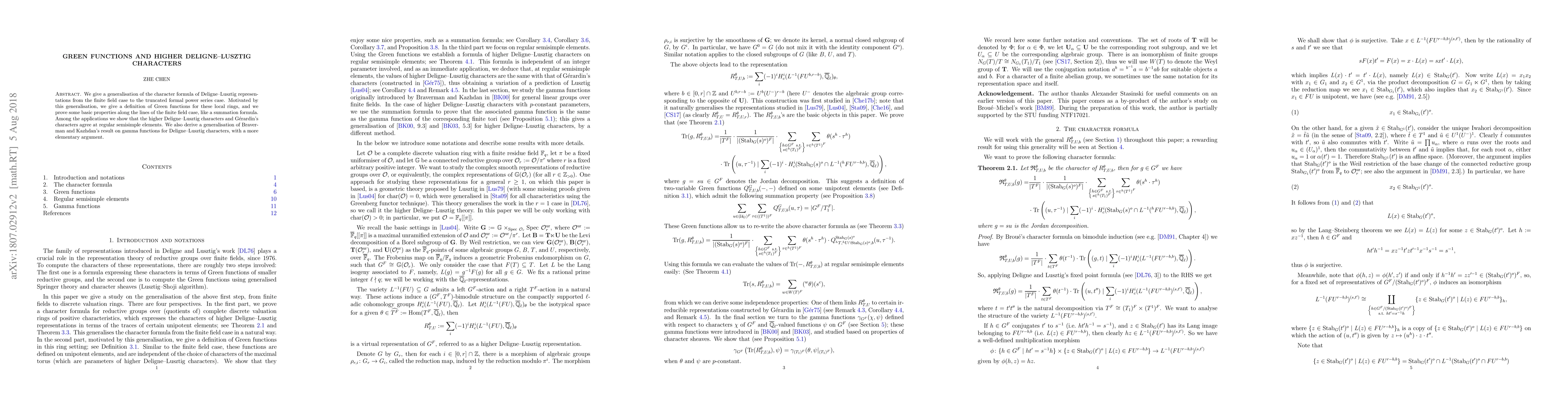 This paper extends the character formula for Deligne-Lusztig representations to truncated formal power series, introduces Green functions for local rings, and proves basic properties including a summation formula. It shows agreement between higher Deligne-Lusztig characters and Gérardin's characters at regular semisimple elements, and provides an elementary generalization of Braverman and Kazhdan's result on gamma functions for Deligne-Lusztig characters.