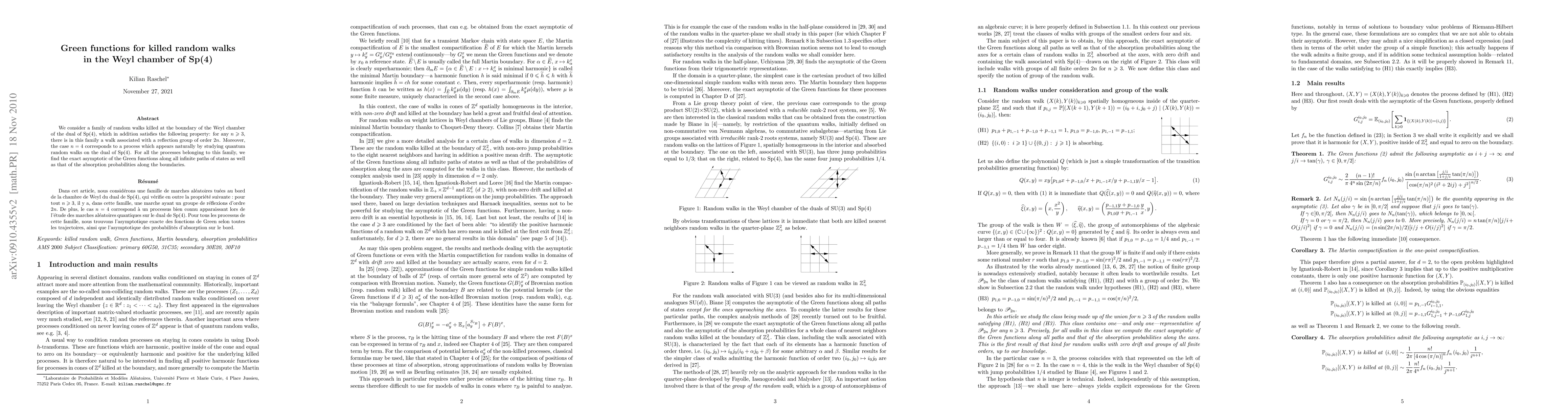 This paper investigates a family of killed random walks in the Weyl chamber of the dual of $\rm{Sp}(4)$, deriving the exact asymptotic behavior of their Green functions and absorption probabilities. The study includes walks associated with reflection groups of order $2n$, with a special case for $n=4$ linked to quantum random walks.