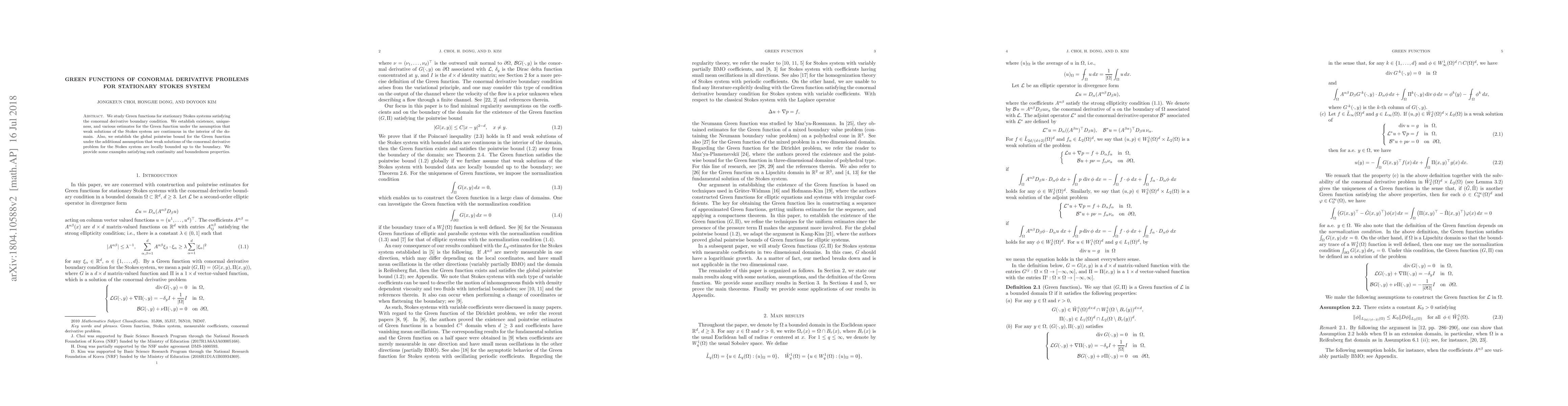 This paper investigates Green functions for stationary Stokes systems with conormal derivative boundary conditions, proving their existence, uniqueness, and various estimates, assuming continuity of weak solutions in the domain. It also provides a global pointwise bound for these Green functions under the condition that weak solutions are locally bounded up to the boundary.