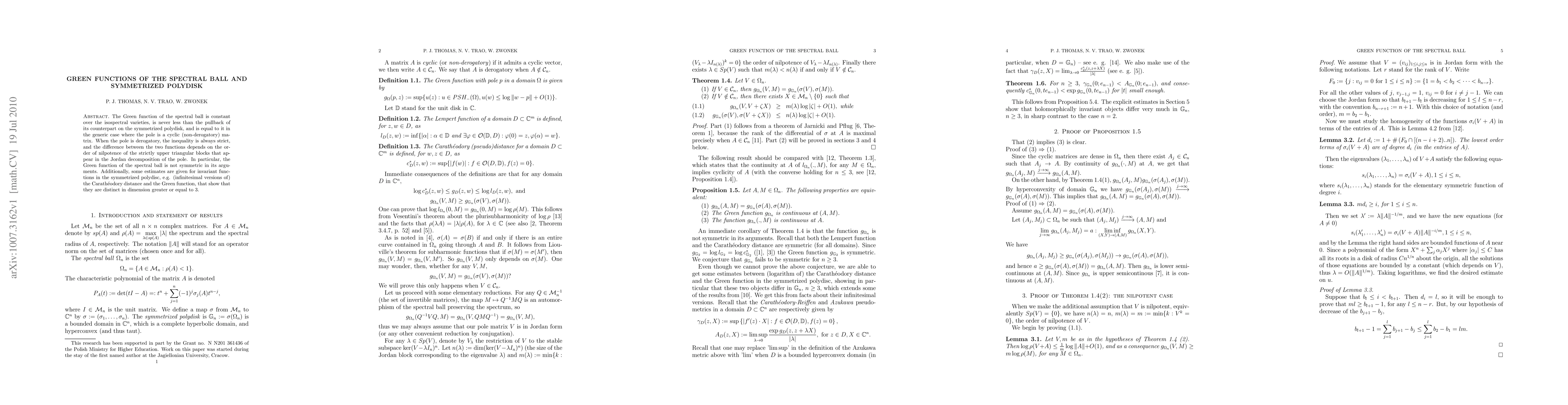 This paper investigates the Green function of the spectral ball and compares it with the Green function of the symmetrized polydisk, revealing that the former is always greater than or equal to the latter, with equality in the generic case of a cyclic matrix. It also discusses the non-symmetric nature of the spectral ball's Green function and provides estimates for invariant functions in higher dimensions.