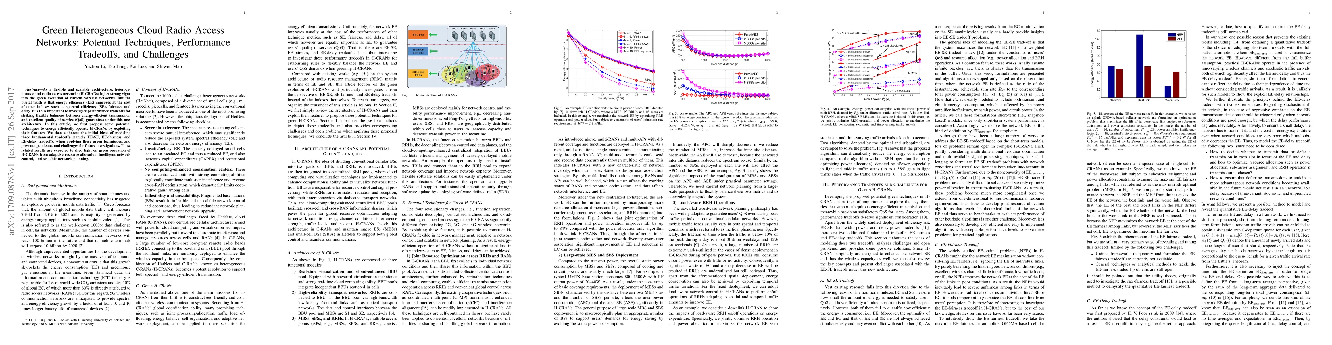 This paper explores techniques for enhancing energy efficiency in heterogeneous cloud radio access networks (H-CRANs) while considering tradeoffs with spectral efficiency, fairness, and delay. It proposes potential methods and models three fundamental tradeoffs, highlighting challenges for future research in adaptive resource allocation and network planning.