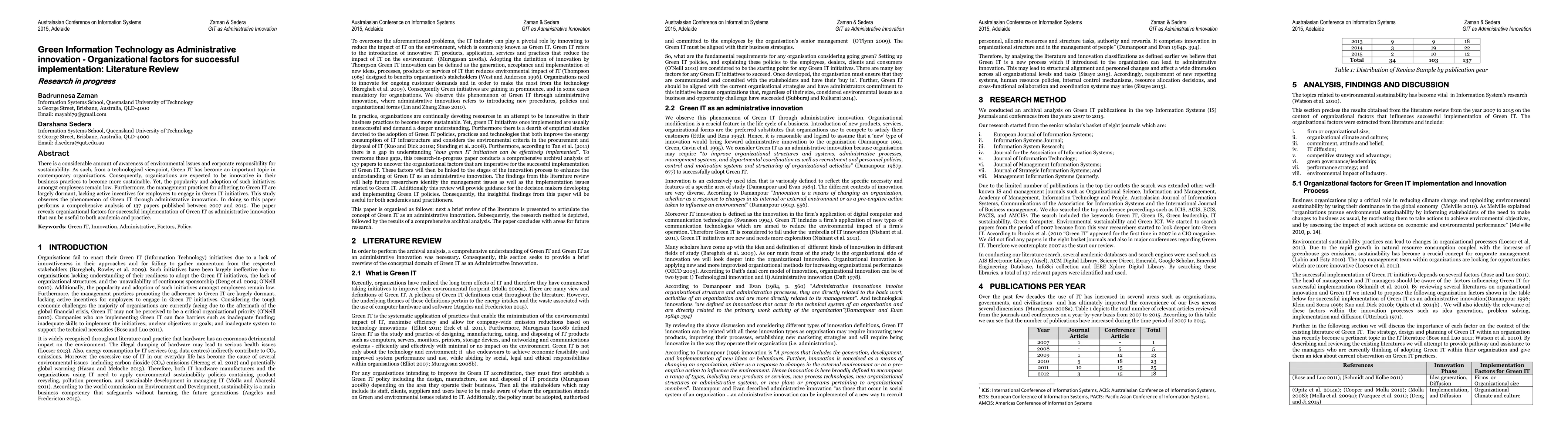 There is a considerable amount of awareness of environmental issues and corporate responsibility for sustainability. As such, from a technological viewpoint, Green IT has become an important topic in contemporary organizations. Consequently, organisations are expected to be innovative in their business practices to become more sustainable. Yet, the popularity and adoption of such initiatives amongst employees remain low. Furthermore, the management practices for adhering to Green IT are largely dormant, lacking active incentives for employees to engage in Green IT initiatives. This study observes the phenomenon of Green IT through administrative innovation. In doing so this paper performs a comprehensive analysis of 137 papers published between 2007 and 2015. The paper reveals organizational factors for successful implementation of Green IT as administrative innovation that can be useful to both academia and practice.
