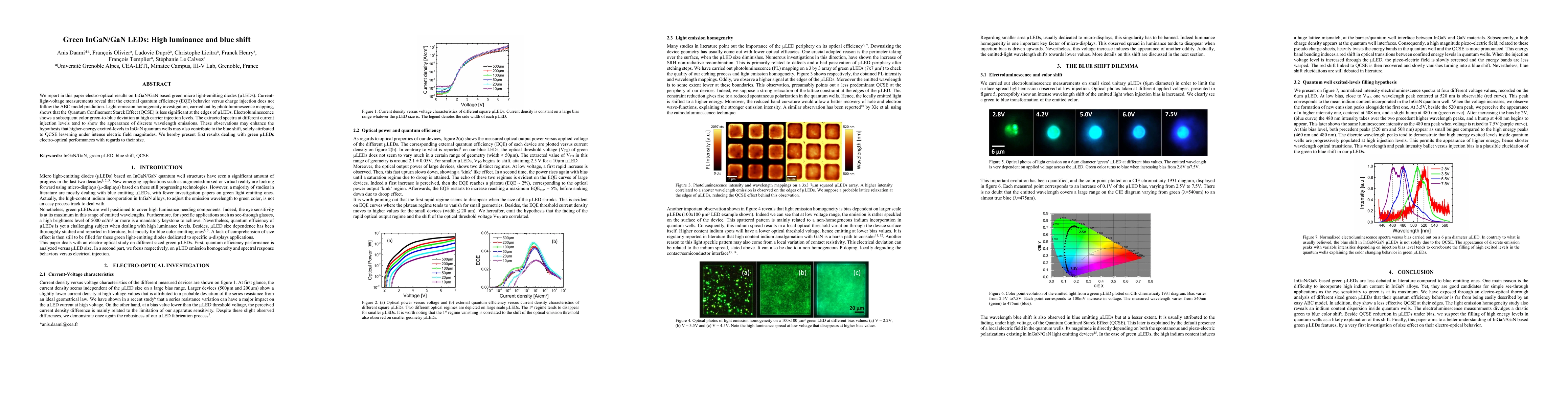 We report in this paper electro-optical results on InGaN/GaN based green micro light-emitting diodes ({\mu}LEDs). Current light-voltage measurements reveal that the external quantum efficiency (EQE) behavior versus charge injection does not follow the ABC model prediction. Light-emission homogeneity investigation, carried out by photoluminescence mapping, shows that the Quantum Confinement Starck Effect (QCSE) is less significant at the edges of {\mu}LEDs. Electroluminescence shows a subsequent color green-to-blue deviation at high carrier injection levels. The extracted spectra at different current injection levels tend to show the appearance of discrete wavelength emissions. These observations may enhance the hypothesis that higher-energy excited-levels in InGaN quantum wells may also contribute to the blue shift, solely attributed to QCSE lessening under intense electric field magnitudes. We hereby present first results dealing with green {\mu}LEDs electro-optical performances with regards to their size.