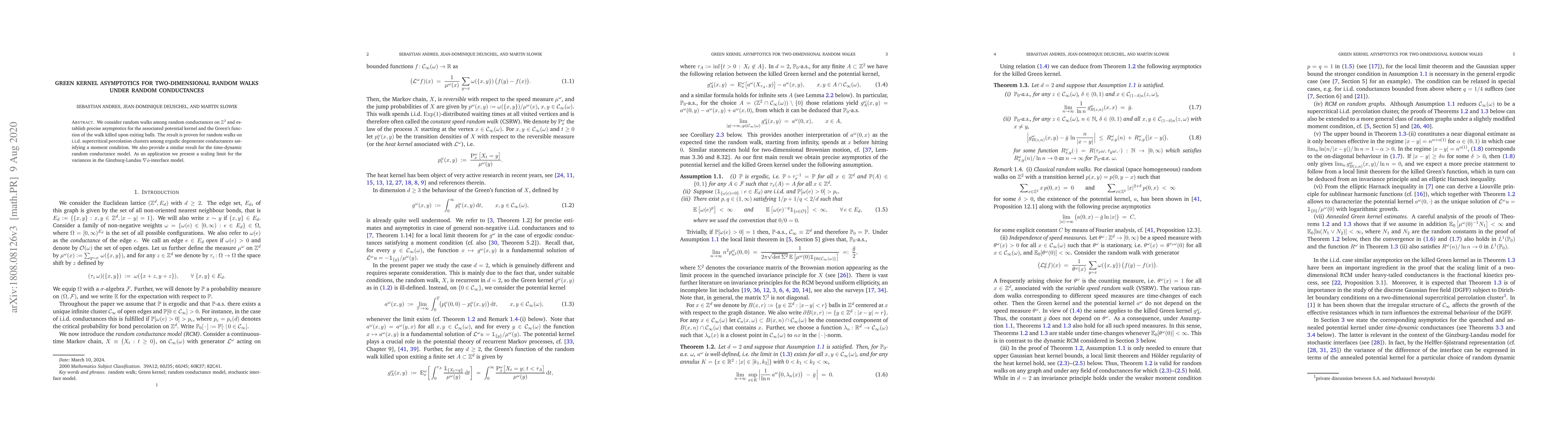 This paper investigates the asymptotic behavior of potential kernels and Green's functions for two-dimensional random walks on random conductances, establishing precise results for both stationary and time-dynamic models. The findings contribute to the understanding of scaling limits in the Ginzburg-Landau $\nabla \phi$-interface model.