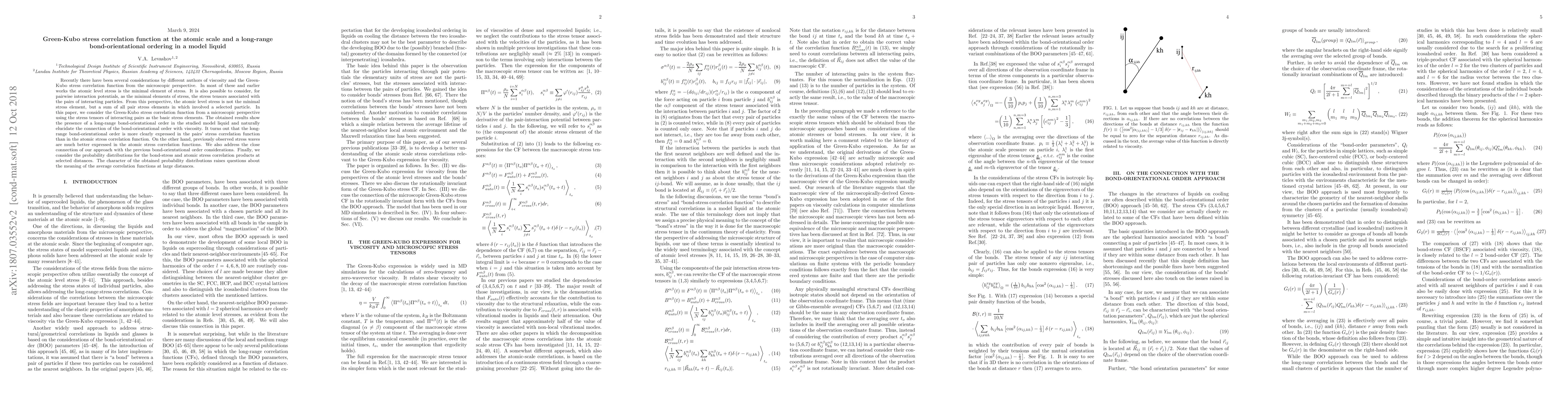 This paper investigates the Green-Kubo stress correlation function at the atomic scale, revealing a long-range bond-orientational order in a model liquid when considering pair stress tensors. It finds that bond-orientational order is more evident in pair stress correlations than in atomic stress correlations, while stress waves are better captured in atomic stress functions.
