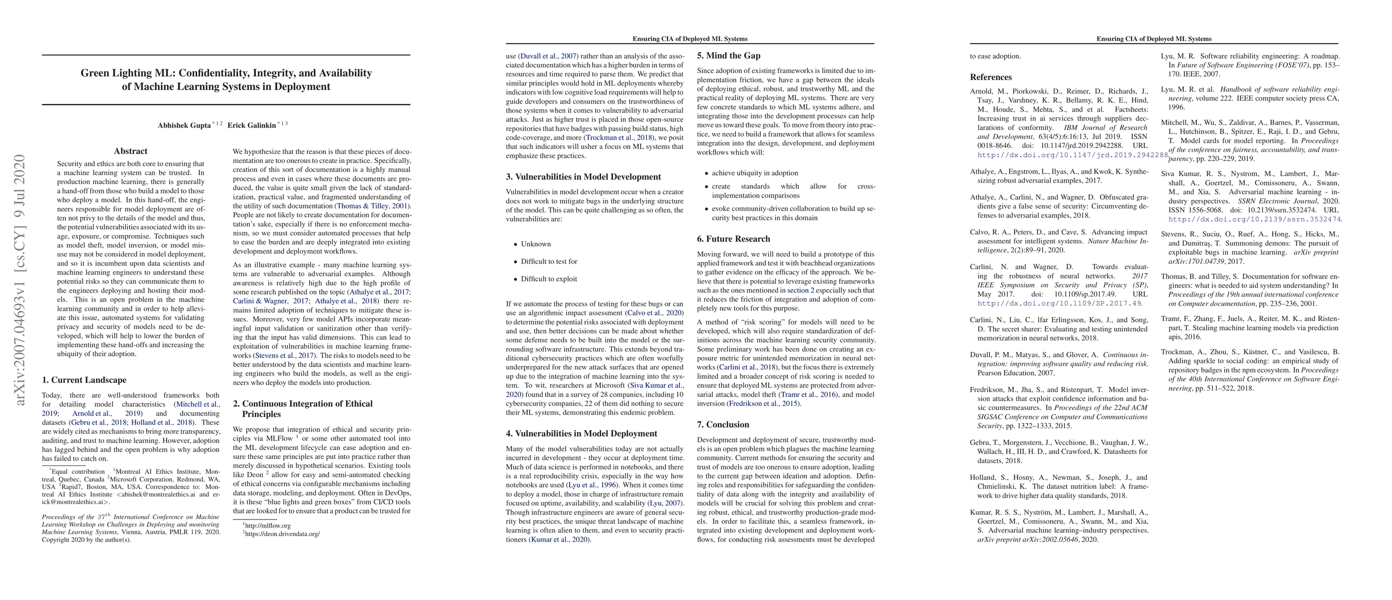 Security and ethics are both core to ensuring that a machine learning system can be trusted. In production machine learning, there is generally a hand-off from those who build a model to those who deploy a model. In this hand-off, the engineers responsible for model deployment are often not privy to the details of the model and thus, the potential vulnerabilities associated with its usage, exposure, or compromise. Techniques such as model theft, model inversion, or model misuse may not be considered in model deployment, and so it is incumbent upon data scientists and machine learning engineers to understand these potential risks so they can communicate them to the engineers deploying and hosting their models. This is an open problem in the machine learning community and in order to help alleviate this issue, automated systems for validating privacy and security of models need to be developed, which will help to lower the burden of implementing these hand-offs and increasing the ubiquity of their adoption.
