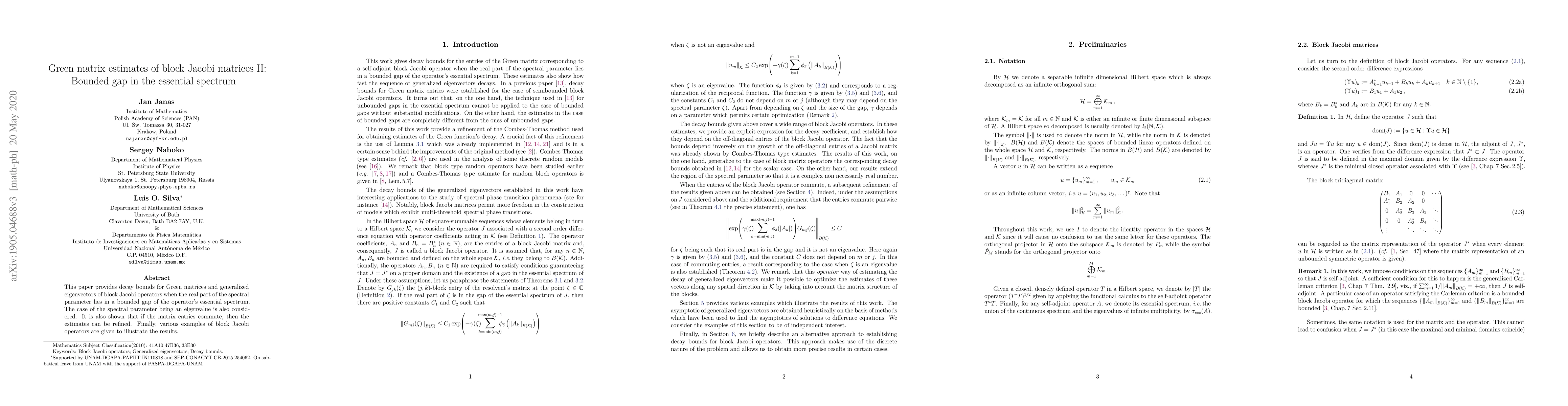 This paper establishes decay bounds for Green matrices and generalized eigenvectors of block Jacobi matrices within a bounded gap of the essential spectrum, with refined estimates if matrix entries commute. Examples of block Jacobi operators are provided to demonstrate these results.