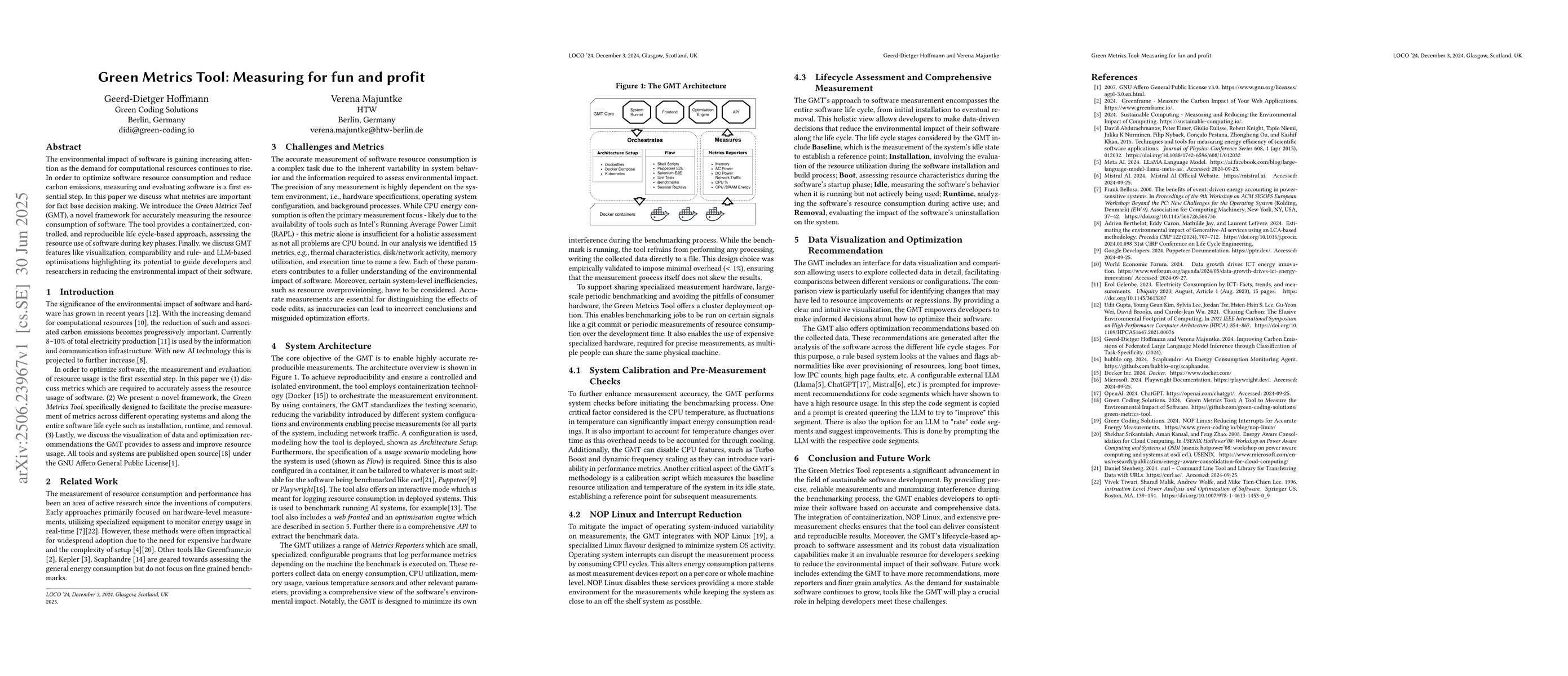 The environmental impact of software is gaining increasing attention as the demand for computational resources continues to rise. In order to optimize software resource consumption and reduce carbon emissions, measuring and evaluating software is a first essential step. In this paper we discuss what metrics are important for fact base decision making. We introduce the Green Metrics Tool (GMT), a novel framework for accurately measuring the resource consumption of software. The tool provides a containerized, controlled, and reproducible life cycle-based approach, assessing the resource use of software during key phases. Finally, we discuss GMT features like visualization, comparability and rule- and LLM-based optimisations highlighting its potential to guide developers and researchers in reducing the environmental impact of their software.