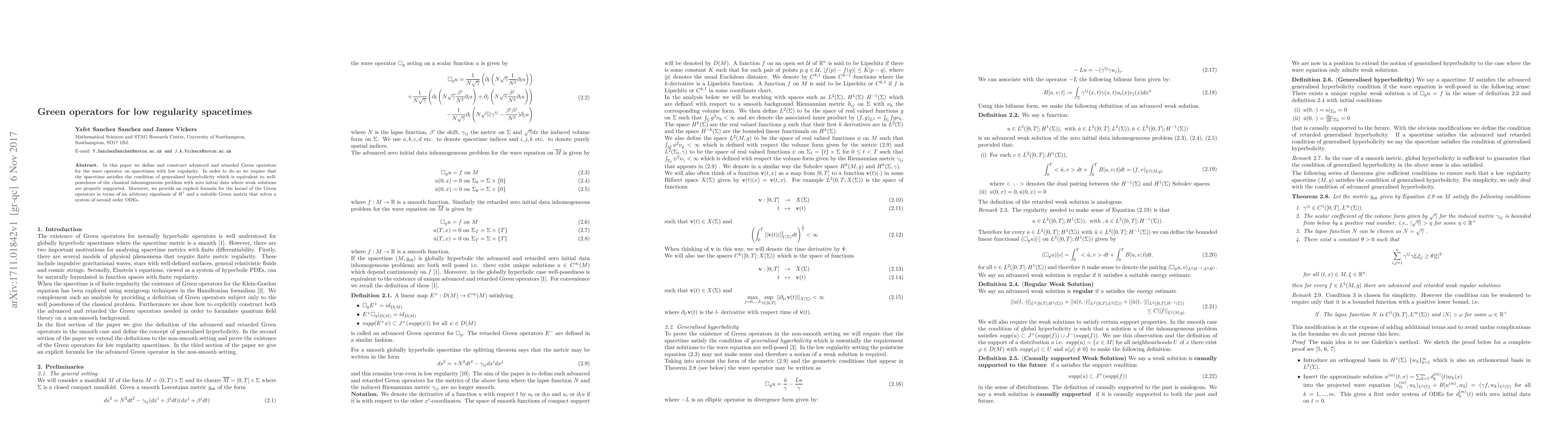 In this paper we define and construct advanced and retarded Green operators for the wave operator on spacetimes with low regularity. In order to do so we require that the spacetime satisfies the condition of generalised hyperbolicity which is equivalent to well- posedness of the classical inhomogeneous problem with zero initial data where weak solutions are properly supported. Moreover, we provide an explicit formula for the kernel of the Green operators in terms of an arbitrary eigenbasis of H 1 and a suitable Green matrix that solves a system of second order ODEs.