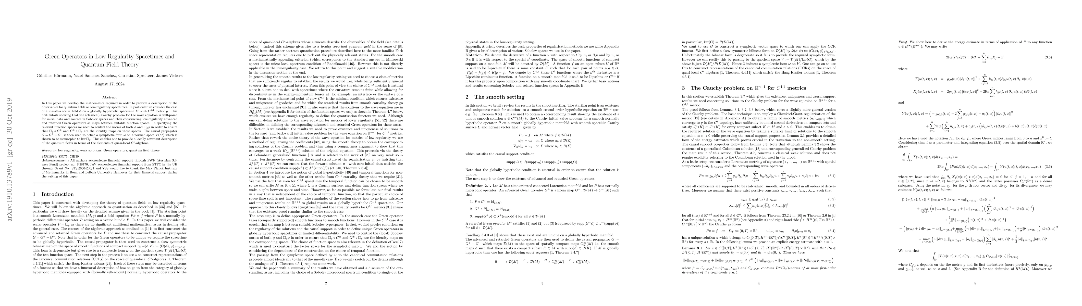 In this paper we develop the mathematics required in order to provide a description of the observables for quantum fields on low-regularity spacetimes. In particular we consider the case of a massless scalar field $\phi$ on a globally hyperbolic spacetime $M$ with $C^{1,1}$ metric $g$. This first entails showing that the (classical) Cauchy problem for the wave equation is well-posed for initial data and sources in Sobolev spaces and then constructing low-regularity advanced and retarded Green operators as maps between suitable function spaces. In specifying the relevant function spaces we need to control the norms of both $\phi$ and $\square_g\phi$ in order to ensure that $\square_g \circ G^\pm$ and $G^\pm \circ \square_g$ are the identity maps on those spaces. The causal propagator $G=G^+-G^-$ is then used to define a symplectic form $\omega$ on a normed space $V(M)$ which is shown to be isomorphic to $\ker \square_g$. This enables one to provide a locally covariant description of the quantum fields in terms of the elements of quasi-local $C^*$-algebras.