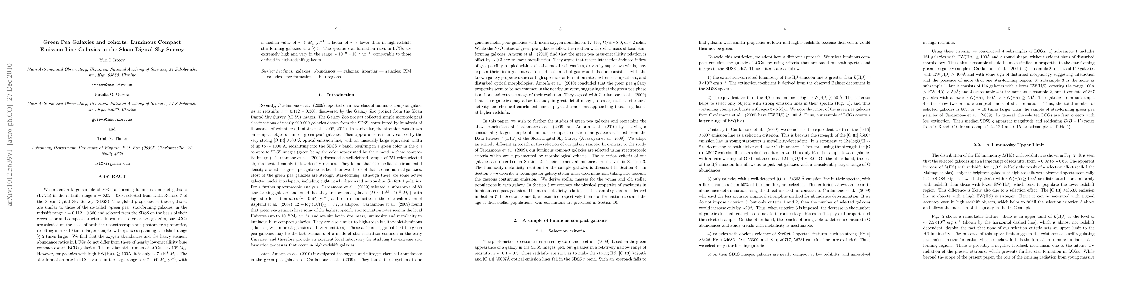 This paper presents a large sample of 803 luminous compact emission-line galaxies (LCGs) from the Sloan Digital Sky Survey, selected based on both spectroscopic and photometric properties. These galaxies exhibit high star formation rates and specific star formation rates comparable to those in high-redshift galaxies, despite having a median stellar mass of ~1e9 Msun.