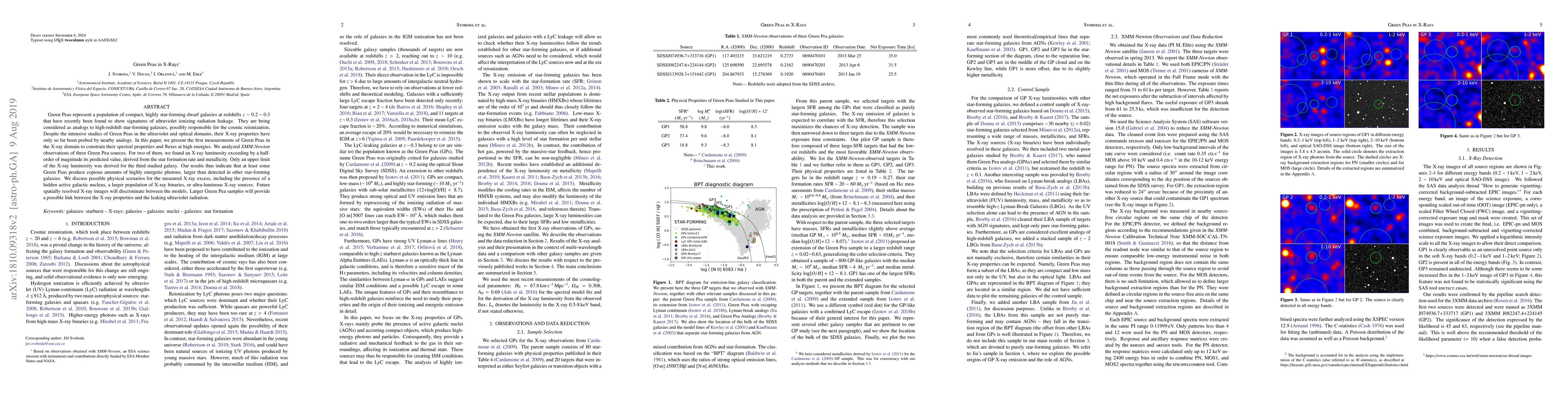 Green Peas represent a population of compact, highly star-forming dwarf galaxies at redshifts z ~ 0.2-0.3 that have recently been found to show signatures of ultraviolet ionizing radiation leakage. They are being considered as analogs to high-redshift star-forming galaxies, possibly responsible for the cosmic reionization. Despite the intensive studies of Green Peas in the ultraviolet and optical domains, their X-ray properties have only so far been probed by nearby analogs. In this paper, we present the first measurements of Green Peas in the X-ray domain to constrain their spectral properties and fluxes at high energies. We analyzed XMM-Newton observations of three Green Pea sources. For two of them, we found an X-ray luminosity exceeding by a half-order of magnitude its predicted value, derived from the star formation rate and metallicity. Only an upper limit of the X-ray luminosity was derived for the third studied galaxy. Our results thus indicate that at least some Green Peas produce copious amounts of highly energetic photons, larger than detected in other star-forming galaxies. We discuss possible physical scenarios for the measured X-ray excess, including the presence of a hidden active galactic nucleus, a larger population of X-ray binaries, or ultra-luminous X-ray sources. Future spatially resolved X-ray images will discriminate between the models. Larger Green Pea samples will provide a possible link between the X-ray properties and the leaking ultraviolet radiation.