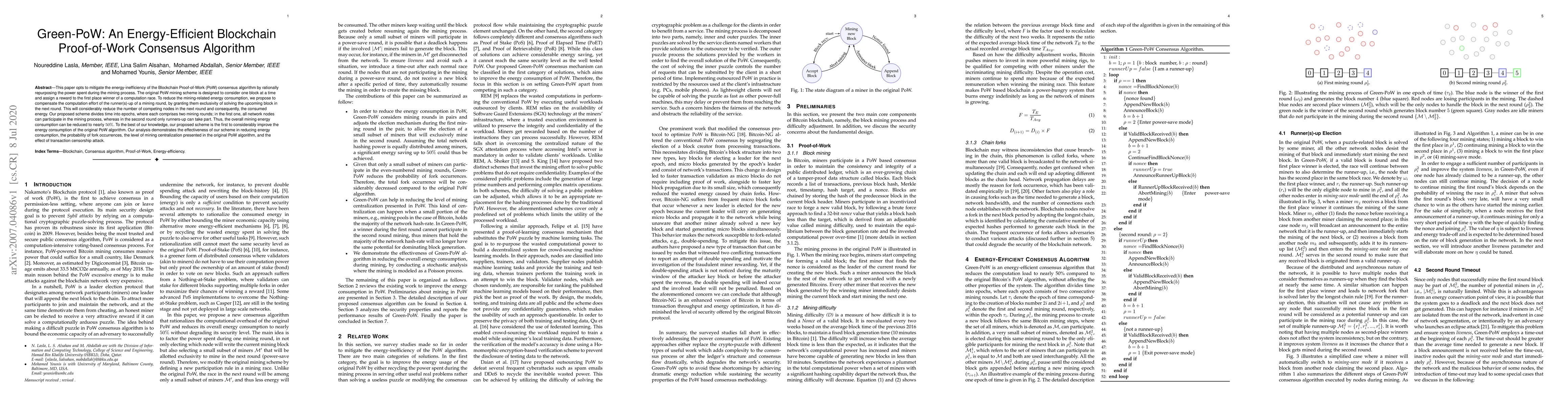 This paper proposes Green-PoW, an energy-efficient blockchain consensus algorithm that reduces mining energy consumption by compensating runner-up miners to solve the next block, thus halving overall energy use. The scheme divides time into epochs with two mining rounds, significantly lowering competition and energy use.