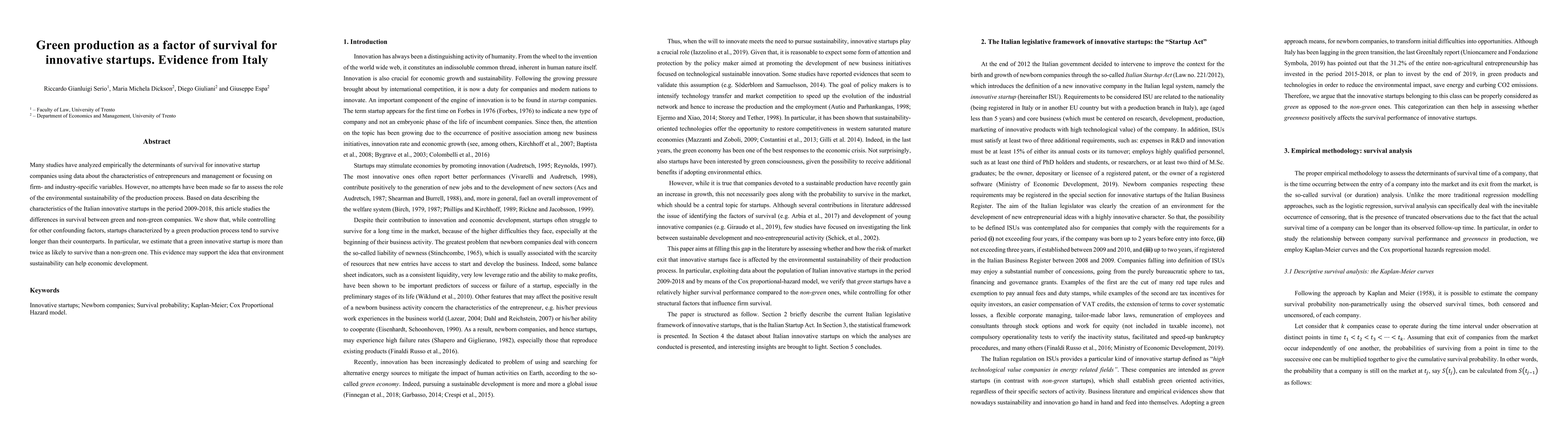Many studies have analyzed empirically the determinants of survival for innovative startup companies using data about the characteristics of entrepreneurs and management or focusing on firm- and industry-specific variables. However, no attempts have been made so far to assess the role of the environmental sustainability of the production process. Based on data describing the characteristics of the Italian innovative startups in the period 2009-2018, this article studies the differences in survival between green and non-green companies. We show that, while controlling for other confounding factors, startups characterized by a green production process tend to survive longer than their counterparts. In particular, we estimate that a green innovative startup is more than twice as likely to survive than a non-green one. This evidence may support the idea that environment sustainability can help economic development.
